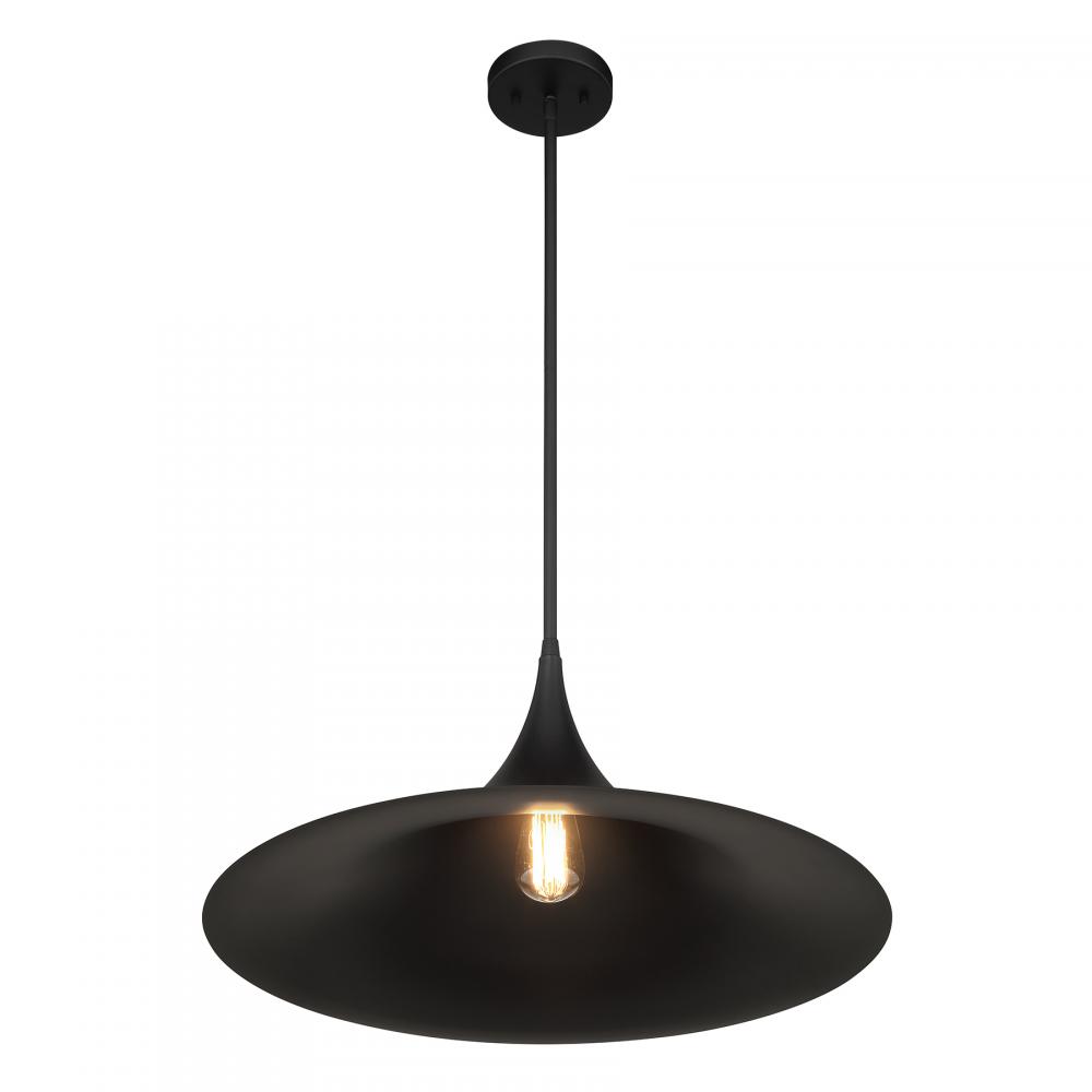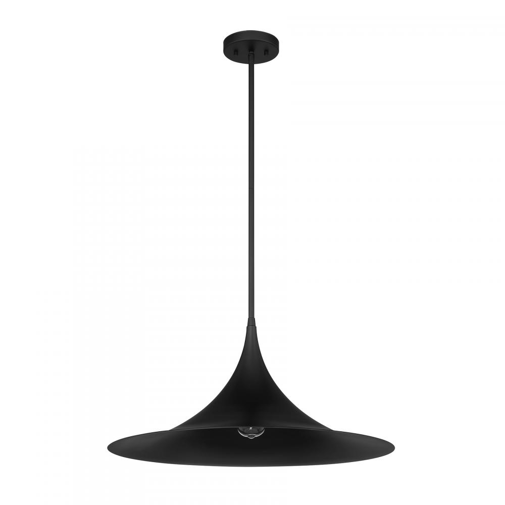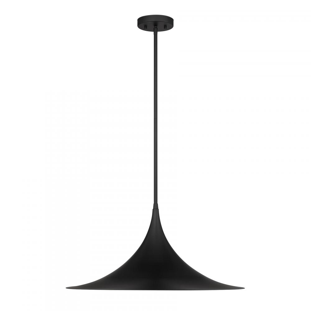 This Savoy House Bowdin 1-light pendant is beautiful in its simplicity. Its shade curves outward, bringing you a highly dramatic style that is perfect alone or in groupings. Finished in Matte Black. At 24" wide, with an adjustable height ranging from 11.25" to 65.25", it's great for large-scale spaces. Comes with four 12" downrods and one 6" downrod. Uses one standard size bulb of up to 60 watts. The bulb is not included.