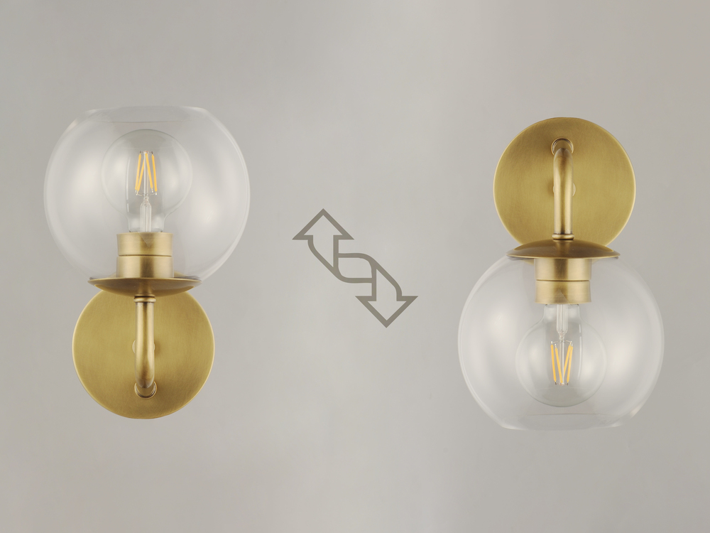 Vessels of heavy weight Clear glass are supported on frames of solid brass finished in a hand rubbed Natural Aged Brass finish. A versatile collection of up and down configurations which can be directly attached to the canopy or extended down by the rods s