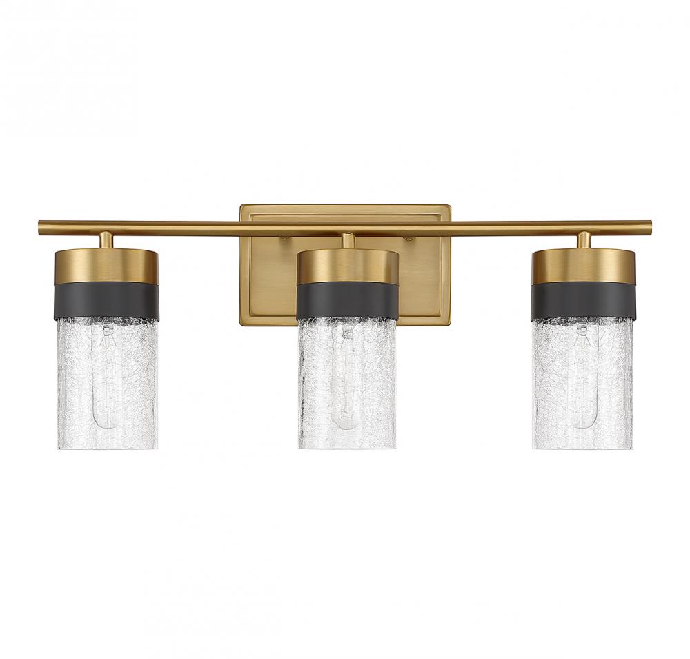 From top to bottom, the Savoy House Brickell 3-light bath vanity light is designed to make any bathroom a standout space. Its classic pairing of warm brass and black is made even better with the addition of textural clear crackled glass shades. Brickell is 8.75" in height, 22" in width and extends 5" from the wall. It uses 3 standard size bulbs of up to 60 watts per bulb (bulbs not included).
