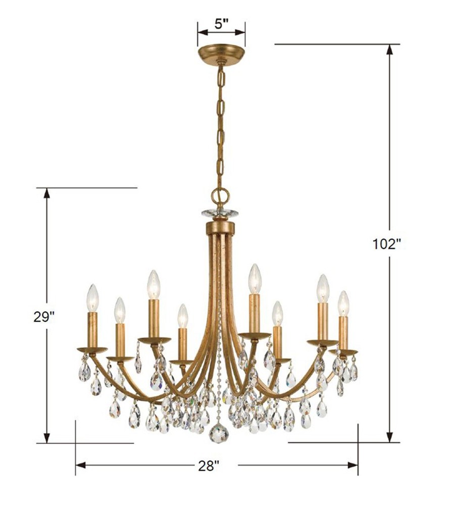 A classic yet moderns style with slim, upward curved arms strung in curtains of faceted crystal jewels, create visual interest. Complementary to a variety of home décor styles this chandelier will work in any space.