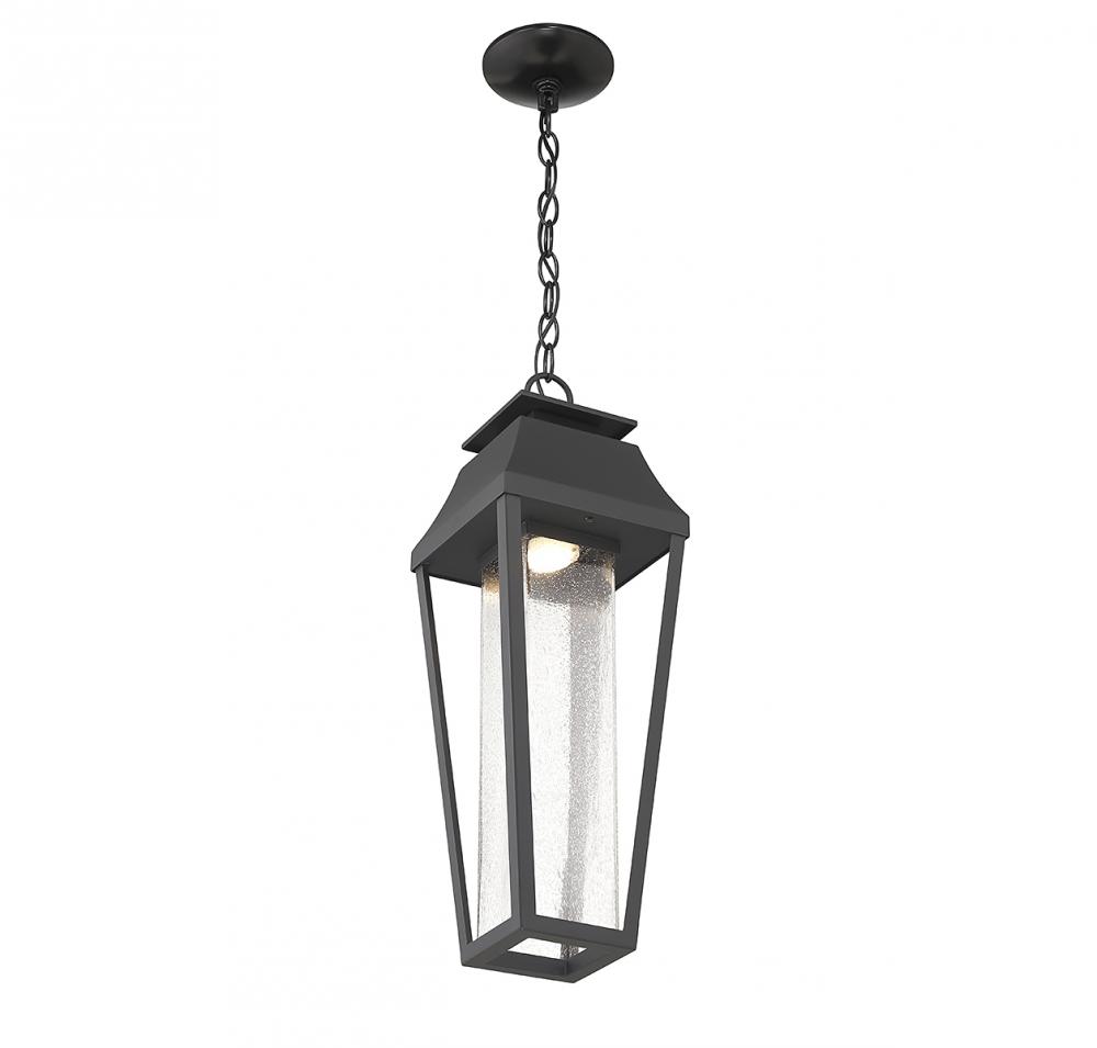 From Savoy House, the Brookline 1-light outdoor hanging light showcases a more contemporary take on classic lantern-style illumination with a central column of clear seeded glass illuminated by integrated LED light. The matte black finish adds versatility. Brookline is 21.75" in height and 7.25" in width.
