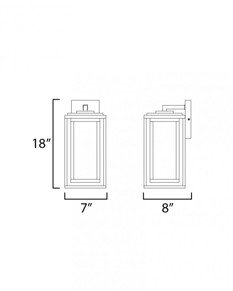 A dual framed structure creates dimension on these outdoor lighting fixtures that is both contemporary and transitional. The construction consists of two frames of square tubing and squared components. The inner frame's Clear Seedy glass reduces glare