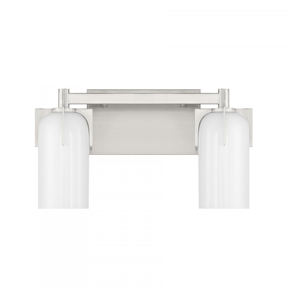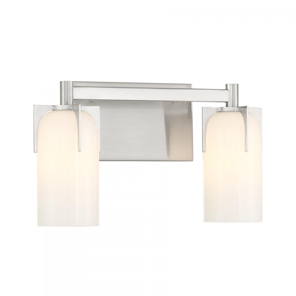 Bring fashionable, vintage-inspired lighting home with the Savoy House Caldwell 2-light bath bar. Etched white opal glass shades are held in place with dramatic jewelry-like prongs that are finished in Satin Nickel. Caldwell is 8.5" in height, 14.75" in width and extends 5.5" from the wall. It uses two candelabra size bulbs of up to 60 watts per bulb. Bulbs not included. This bath light is damp area rated and must be installed as shown.