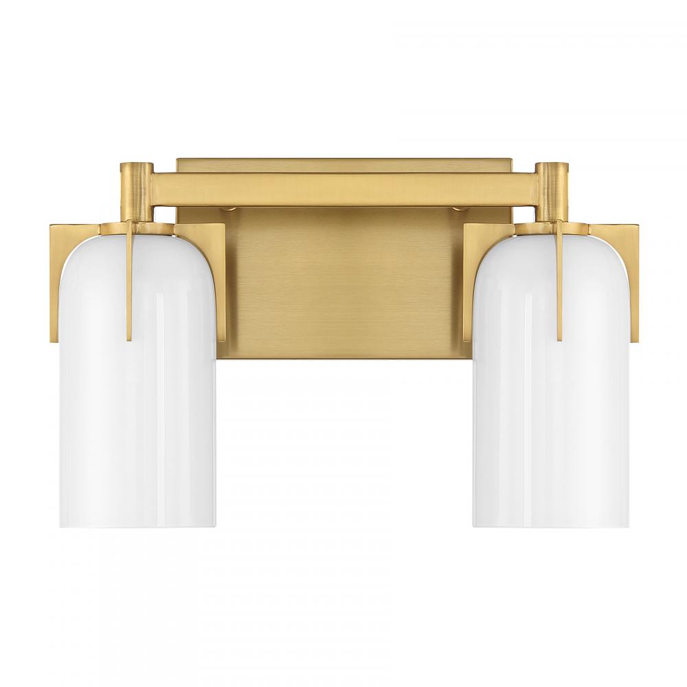 Bring fashionable, vintage-inspired lighting home with the Savoy House Caldwell 2-light bath bar. Etched white opal glass shades are held in place with dramatic jewelry-like prongs that are finished in Warm Brass. Caldwell is 8.5" in height, 14.75" in width and extends 5.5" from the wall. It uses two candelabra size bulbs of up to 60 watts per bulb. Bulbs not included. This bath light is damp area rated and must be installed as shown.