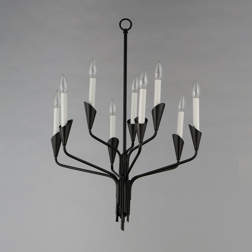 An arrangement that features Black tubing bouqueted at a point with biotic bobeches that contain elongated white candle covers. The organic form of this collection brings visual interest to the collector that is constructed of irregular stem lengths. The t
