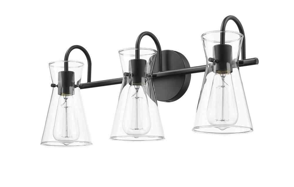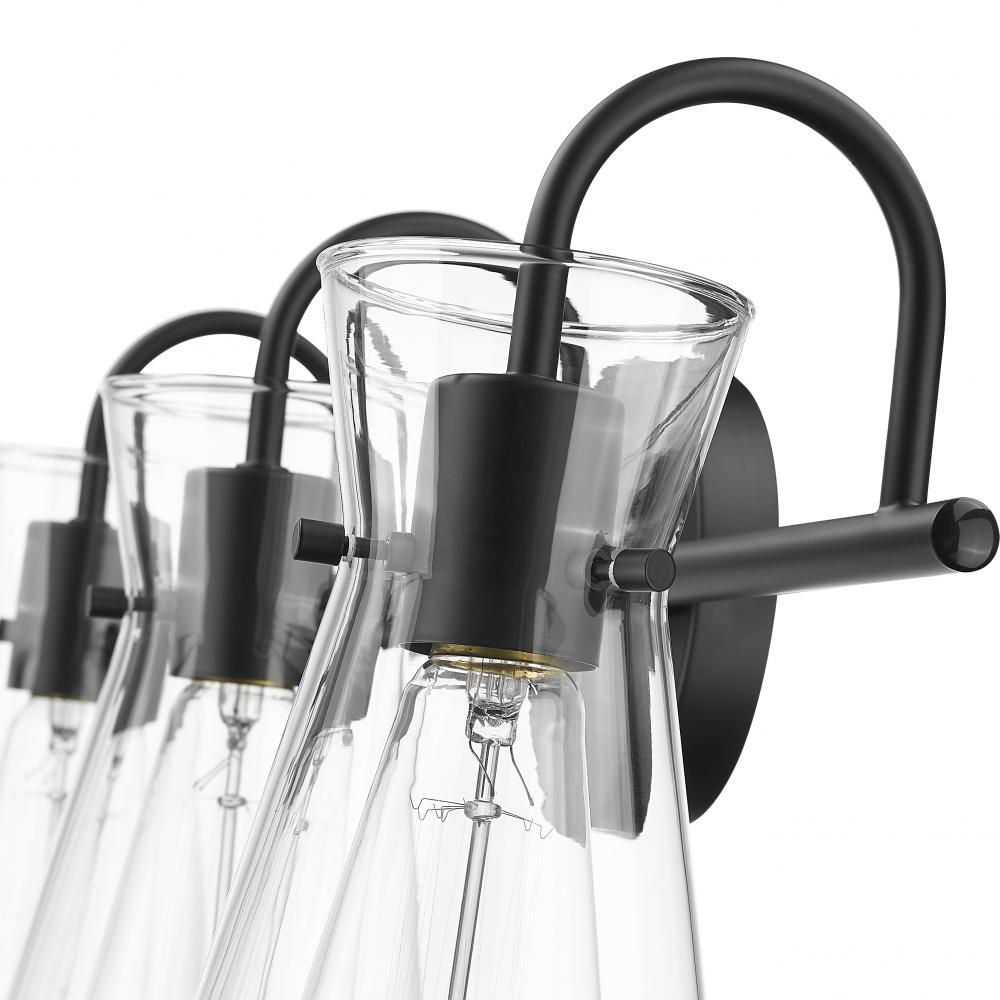 Distinctive beaker-shaped clear glass globes define the look of the Camellia Collection of vanity lighting. The overall design ensures well-defined lighting without shadows in the most needed spaces. The fixtures, featuring swan-neck lines and finished in modern gold, brushed nickel, or matte black, complete the overall design-forward effect and are available in 2-light, 3-light, and 4-light options.