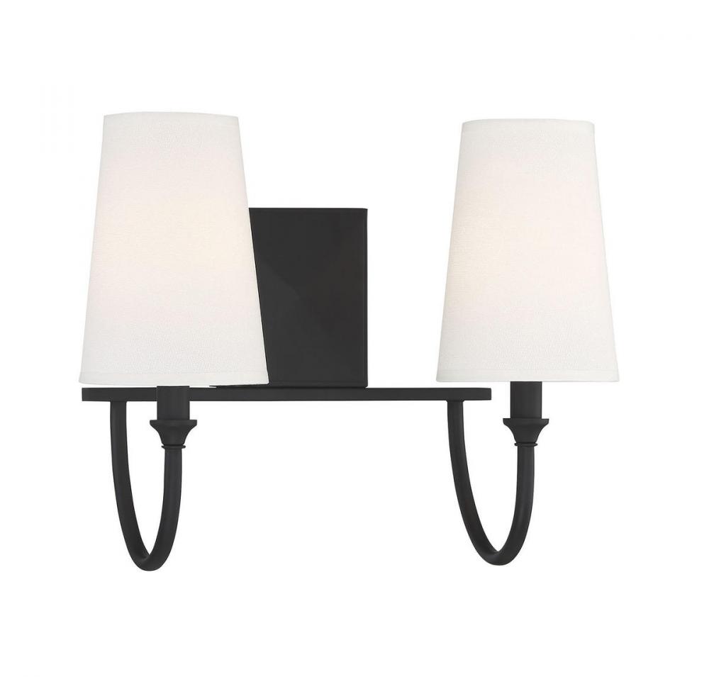 Bring the understated, classic beauty of the Savoy House Cameron 2-light bath bar into your home to create a thoughtful accent in any bathroom. This vanity light features slender, dramatically-curving arms topped with tall, tapered white fabric shades, ensuring a flattering glow. The faceted backplate adds another dimension of style, too. Finished in matte black. This fixture is 15" wide and 12" tall. It extends 8" from the wall. Uses 2 candelabra size bulbs of up to 40 watts each (not included).
