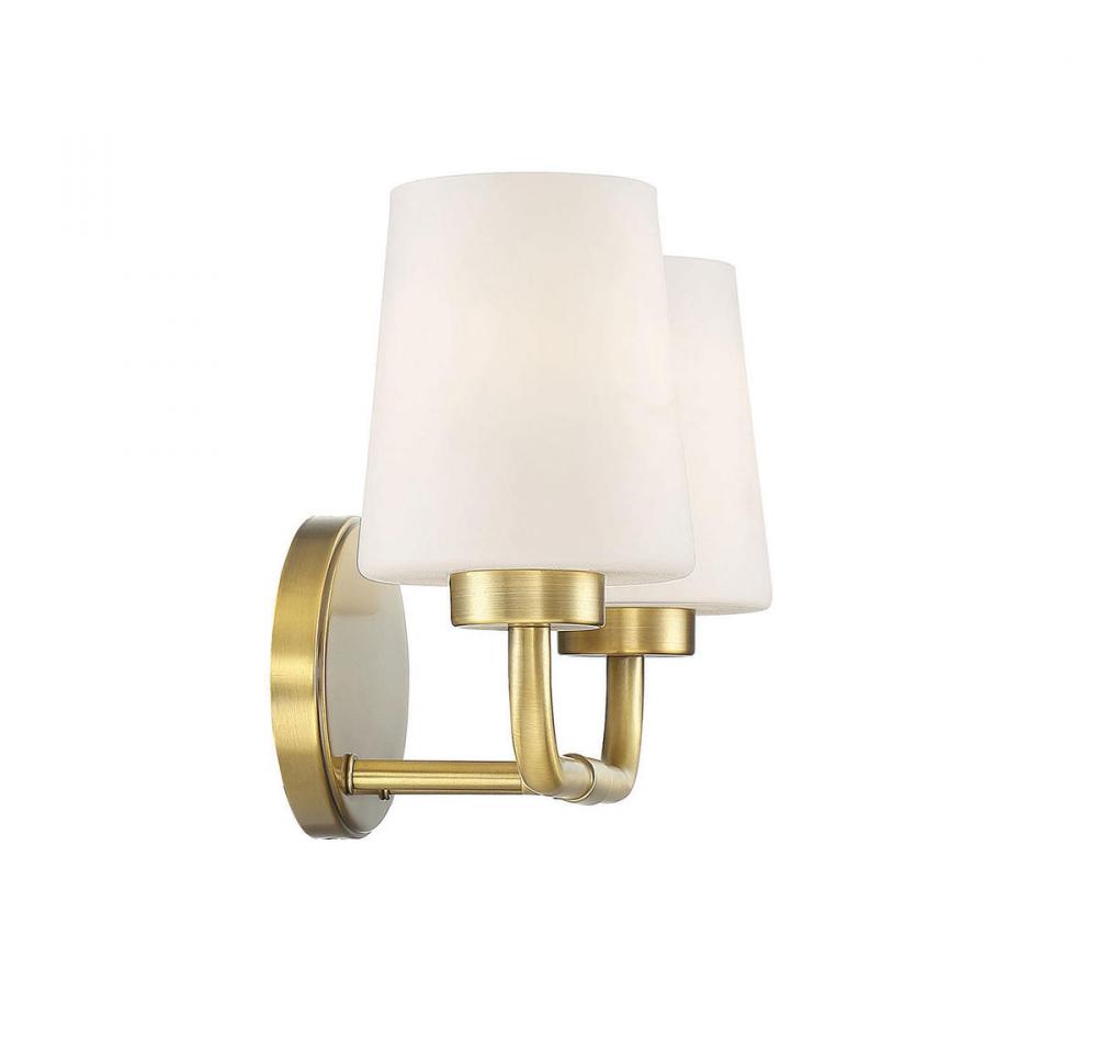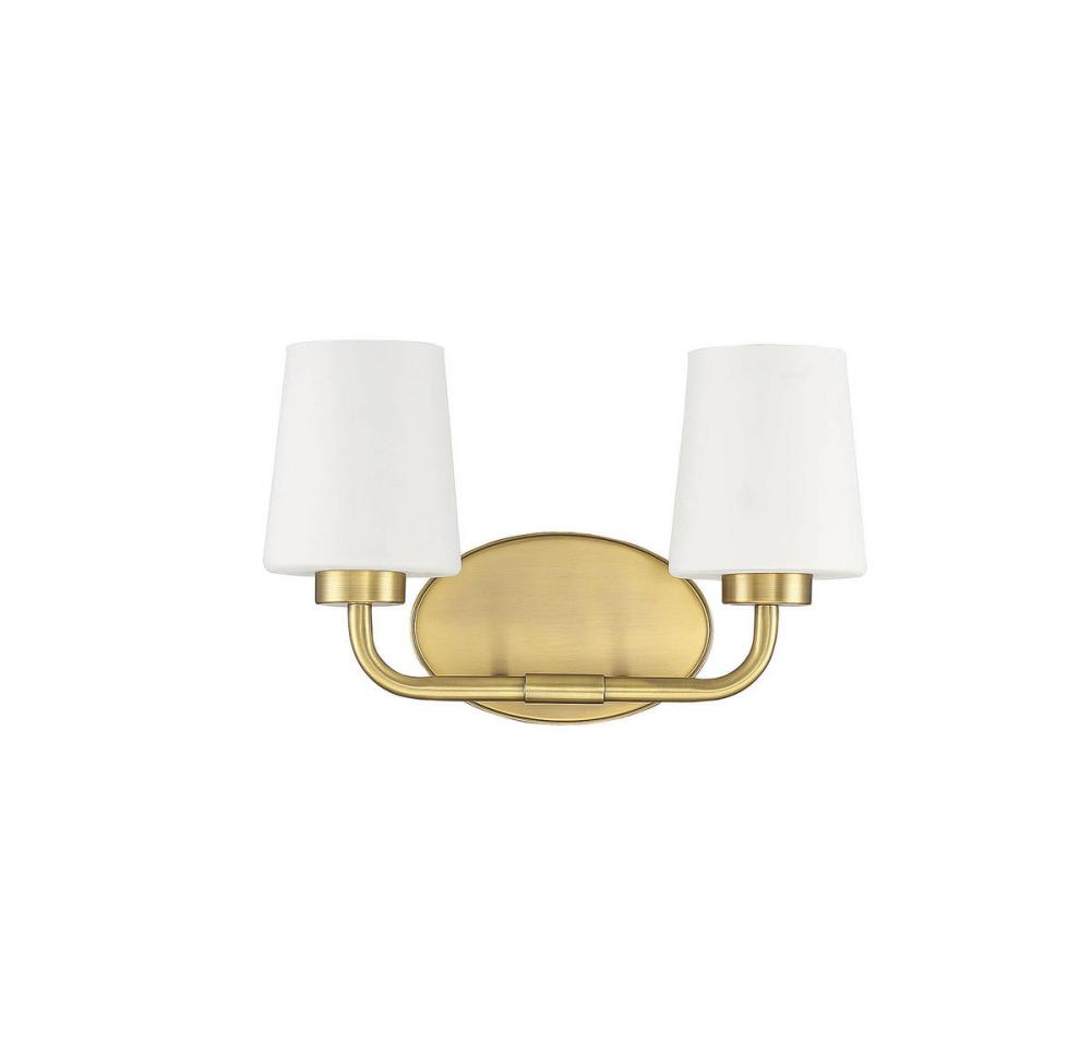 Add chic style to any bathroom with the Savoy House Capra 2-light bath bar. Its substantial structure features classic details along with white opal glass shades that are tapered like lamp shades and open at the top to give off a flattering glow. The large oval-shaped backplate helps to cover up any holes left behind from replacing old bath bars, too. Plus, the hardware for this fixture has been thoughtfully moved to the side of the backplate, allowing for a crisp and clean look. Finished in warm brass. This fixture is 15" wide and 9" tall. It extends 6.5" from the wall. Uses 2 standard size bulbs of up to 60 watts each (not included).