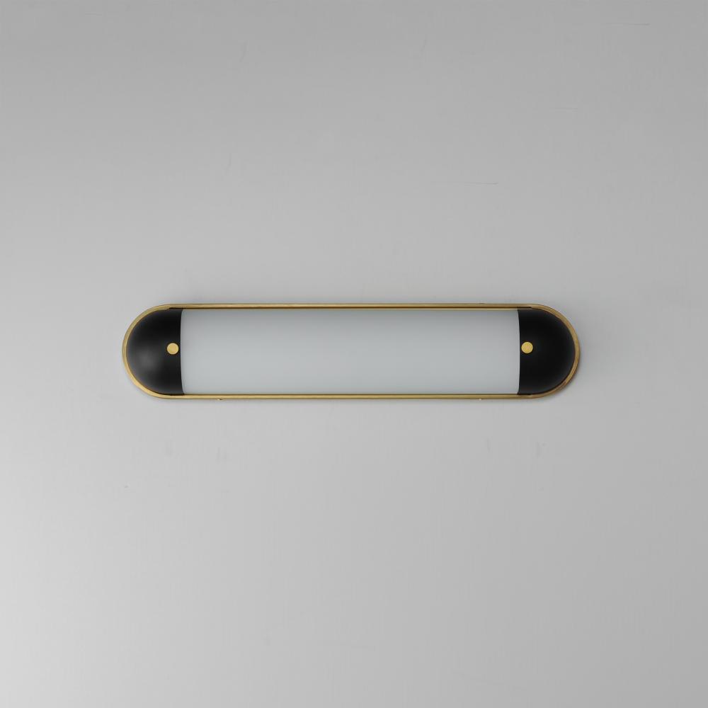 A convex curved glass is encapsulated at both ends to create an overall oval form. Available in a bold two-tone Black and Aged Brass finish or Polished Chrome, these wall sconces add sophistication to hallways and above bath vanities. The integrated LED te