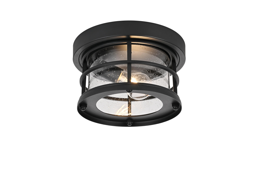 This outdoor flush mount light blends nautical and industrial influences, featuring a rounded frame with horizontal guard rails and a clear seedy glass cylinder for a structured yet functional look. The black-finished iron frame ensures durability, while the textured seedy glass enhances light diffusion, creating a warm, inviting glow. The open-bottom design allows for quick bulb changes, and the flush mount installation makes it a great choice for low-ceiling outdoor spaces such as covered porches, patios, and entryways. Designed for an E26 base bulb (not included), this fixture is also dimmable, offering adjustable brightness levels. ETL Damp Rated, this light is built to withstand moisture and outdoor conditions, making it a reliable and well-structured addition to any exterior setting. Built with marine-grade, corrosion-resistant aluminum, this sconce withstands coastal conditions for long-lasting durability.