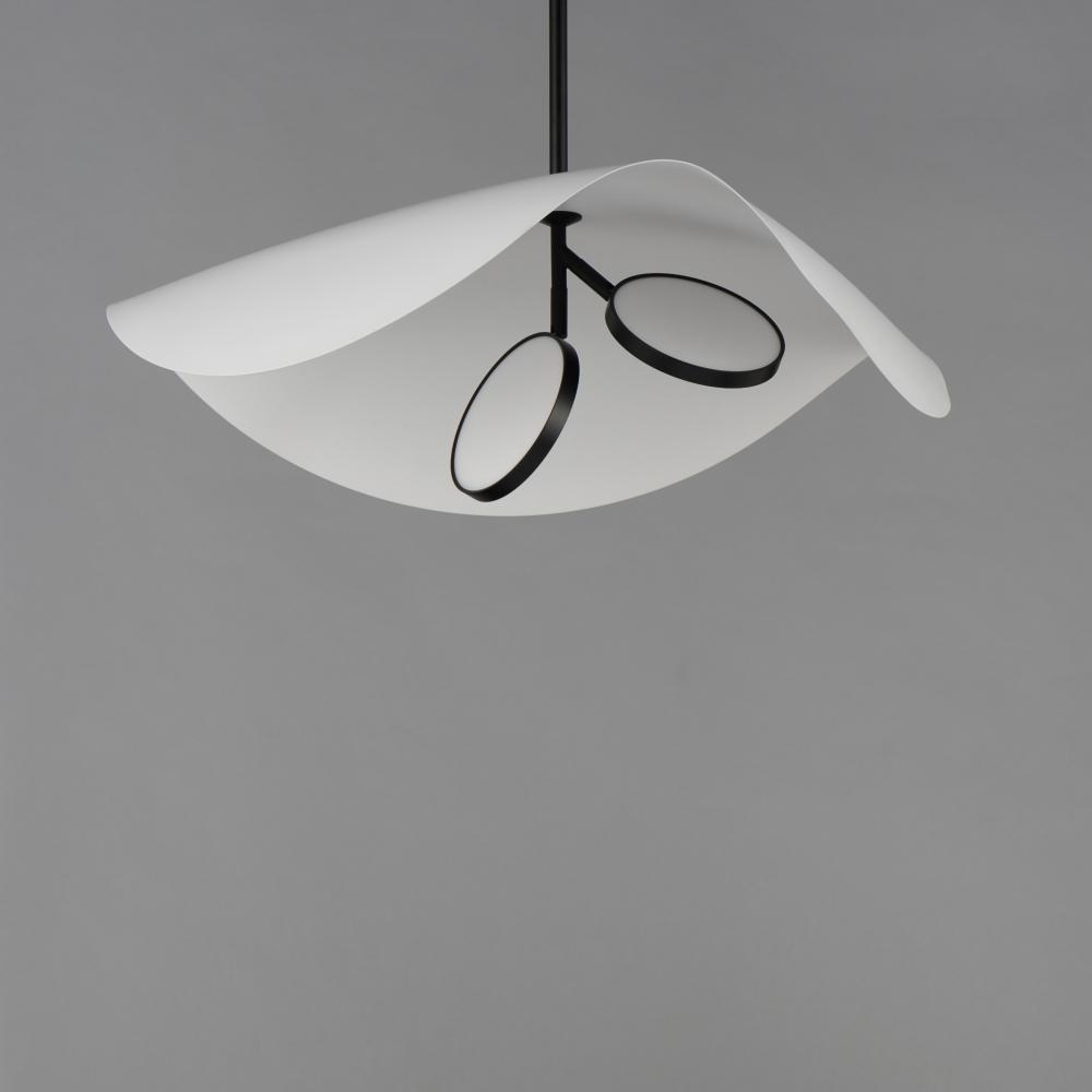 Poetic and organic in design, the undulating form of the metal shade appears to float effortlessly on a slender frame. Abstract discs of LED lighting are encased in round, adjustable heads so that the light can be directed upwards for indirect lighting ref