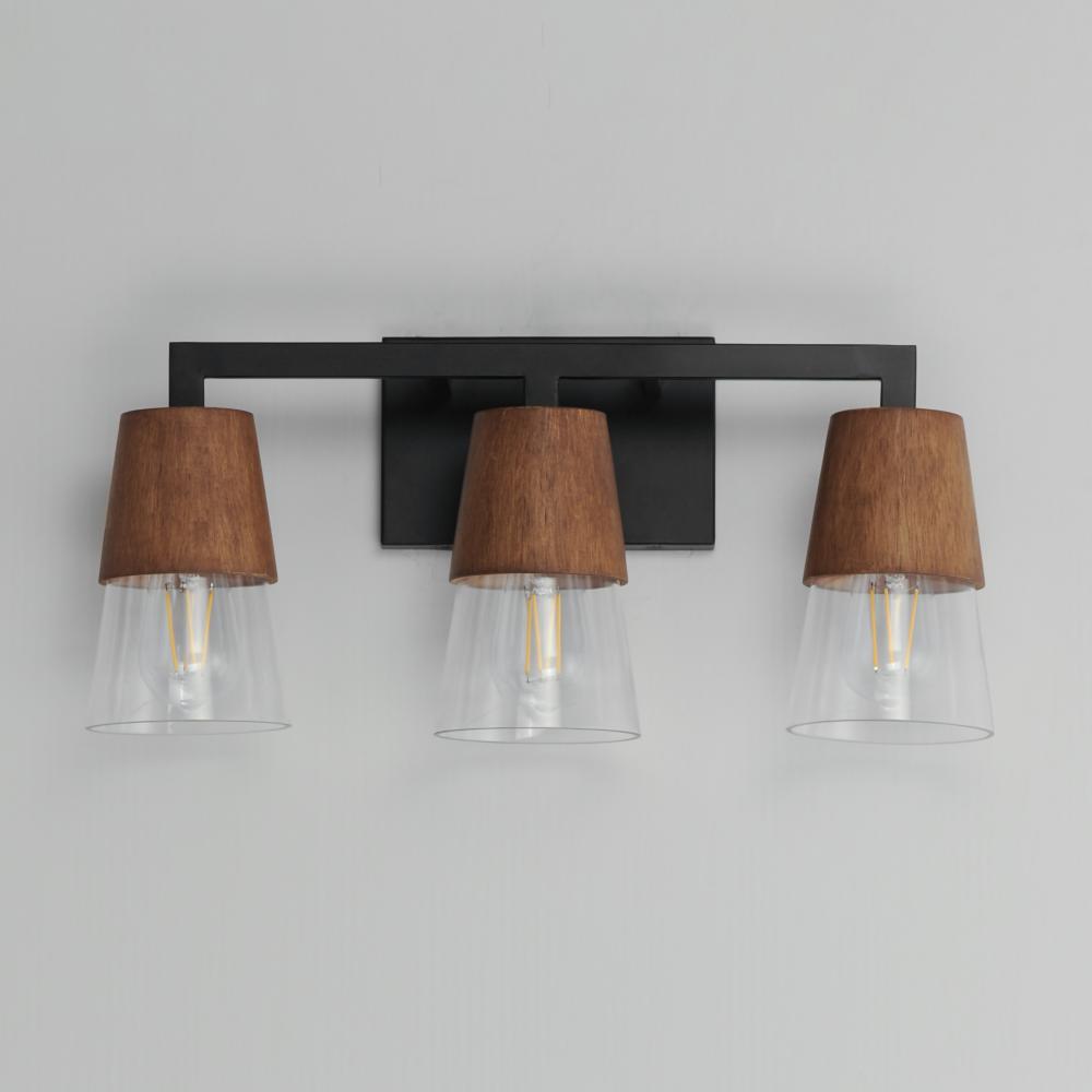 Capped by wood finished in Walnut, this series of bath vanity sconces feature conical Clear Glass shades. Contrasting Matte Black frames of squared tubing add clean geometry to the design. Use decorative lamps in the shades to complete the look.