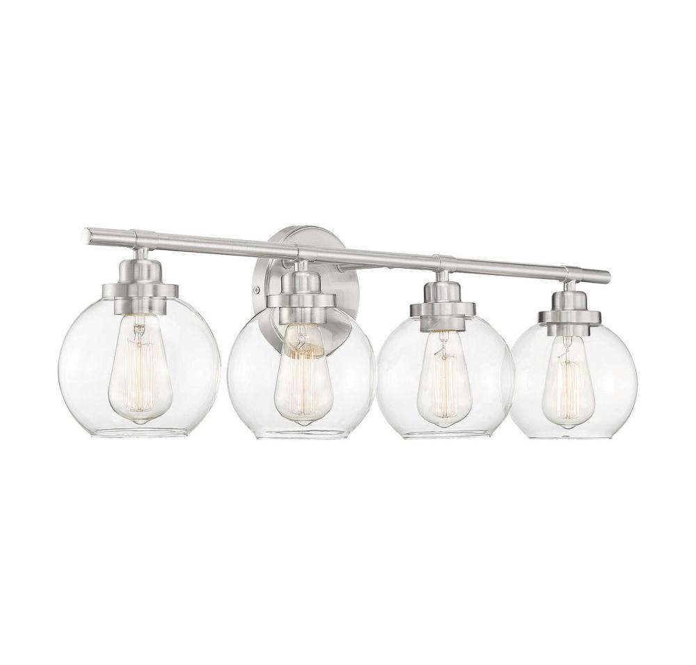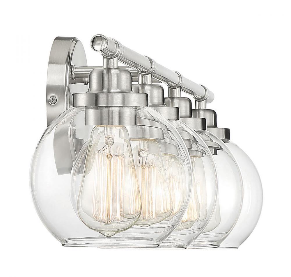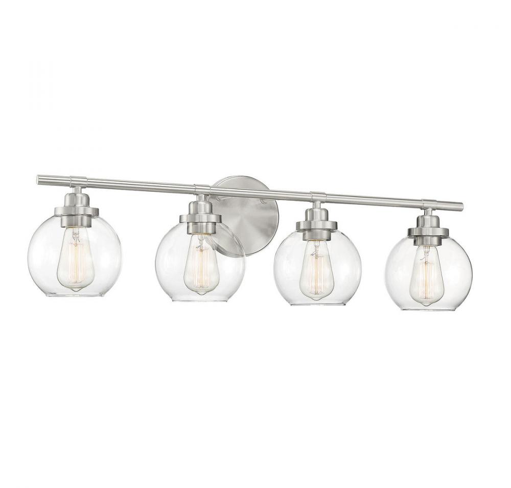 Adding the Savoy House Carson 4-light bath bar easily helps you boost the illumination and the style of any bathroom. Its fishbowl-style clear glass shadesmake a big statement and are open at the bottom, making it easy to replace the bulbs. The streamlined structure offers up subtle detailing with a mid-century modern vibe and the circular backplate echoes the shape of the glass shades. Finished in satin nickel. This fixture is 30" wide and 8.5" tall. It extends 7" from the wall. Uses 4 standard size bulbs of up to 60 watts each (not included).