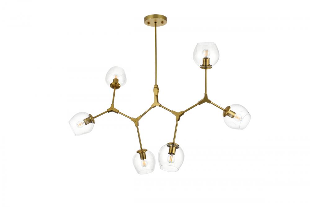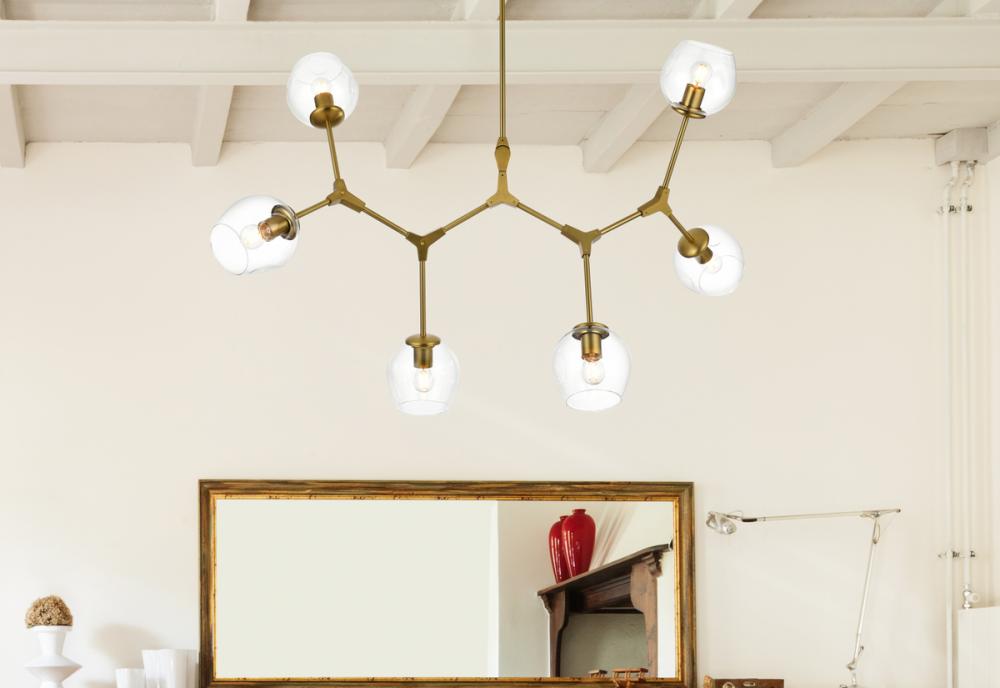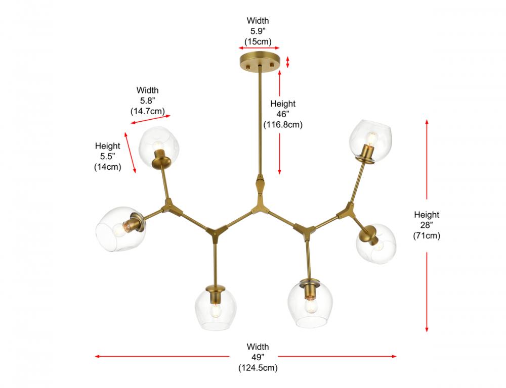 Introducing the Cavoli 49-Inch Chandelier, a perfect fusion of contemporary design and geometric allure. Crafted from durable iron, this visually captivating centerpiece not only adds a sleek modern aesthetic to your space but also ensures a robust and enduring lighting solution. The chandelier holds UL certification, guaranteeing safety and performance adherence. Boasting six lights with clear glass globe shades, this chandelier offers a stunning visual display, complemented by a dimmable feature for personalized lighting preferences. (Bulbs not included). Illuminate your space with confidence and style.