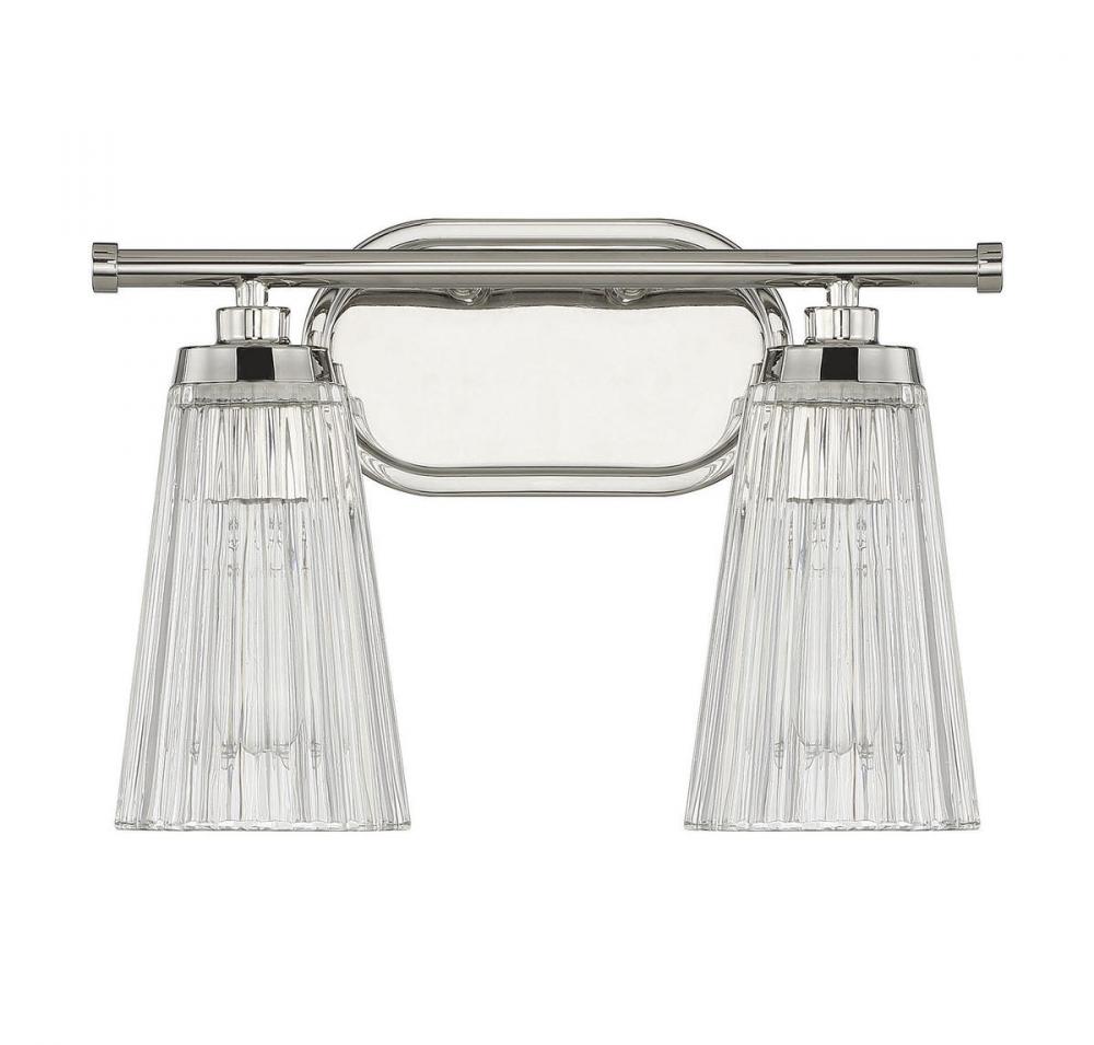 Textured, eye-catching shades of clear ribbed glass take center stage in the Chantilly 2-light bathroom vanity light from Savoy House. Finished in polished nickel. Chantilly is 10" in height, 14" in width and extends 7" from the wall. Uses two standard size bulbs of up to 60 watts per bulb. Damp area rated.