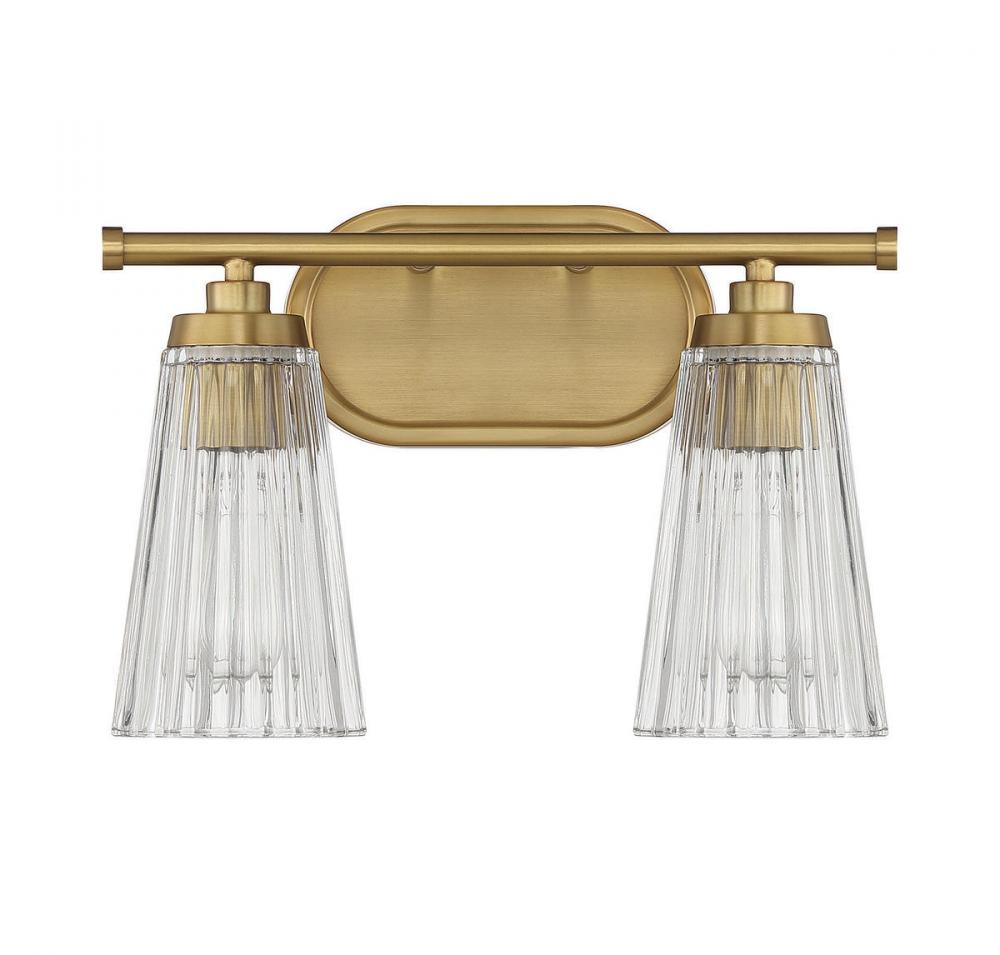 Textured, eye-catching shades of clear ribbed glass take center stage in the Chantilly 2-light bathroom vanity light from Savoy House. Finished in warm brass. Chantilly is 10" in height, 14" in width and extends 7" from the wall. Uses two standard size bulbs of up to 60 watts per bulb. Damp area rated.