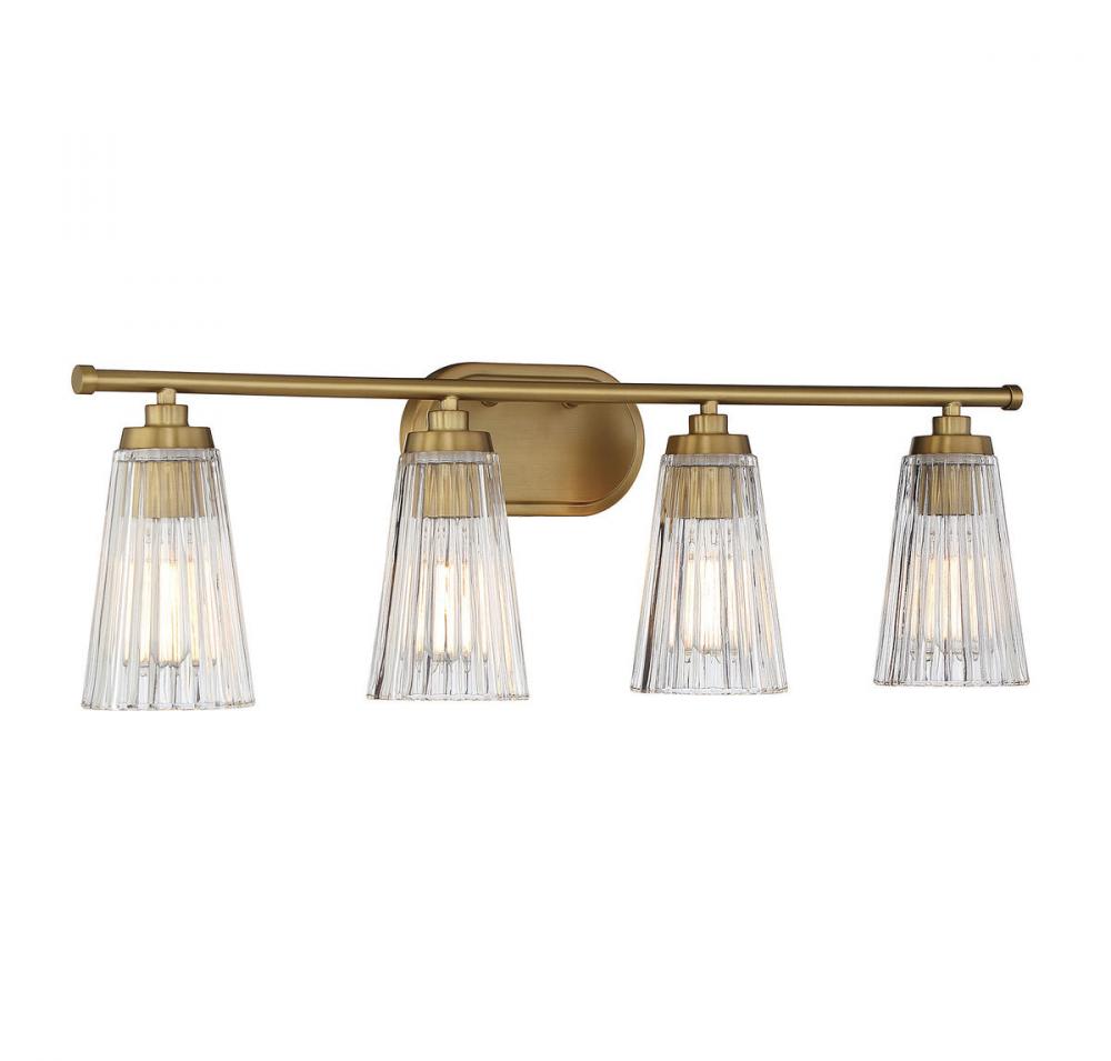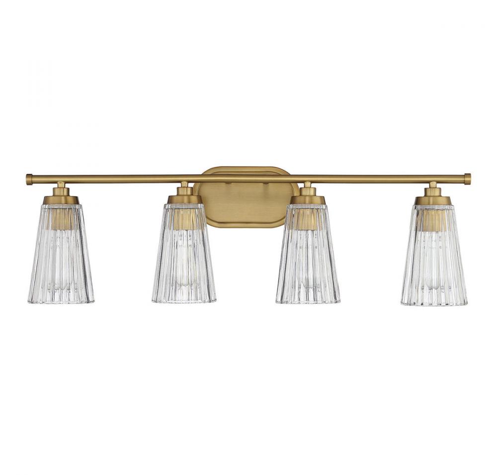 Textured, eye-catching shades of clear ribbed glass take center stage in the Chantilly 4-light bathroom vanity light from Savoy House. Finished in warm brass. Chantilly is 10" in height and 30.5" in width. It extends 7" from the wall. Uses four standard size bulbs of up to 60 watts per bulb. Damp area rated.