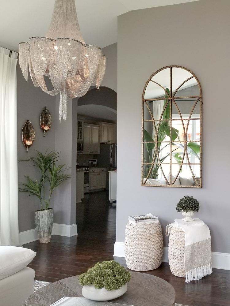 Chantilly collection features metal frames gracefully draped with Nickel finished jewelry chain. Metal trim rings of Polished Nickel add sharp contrast to the softness of the chain, which conceals the xenon light source.