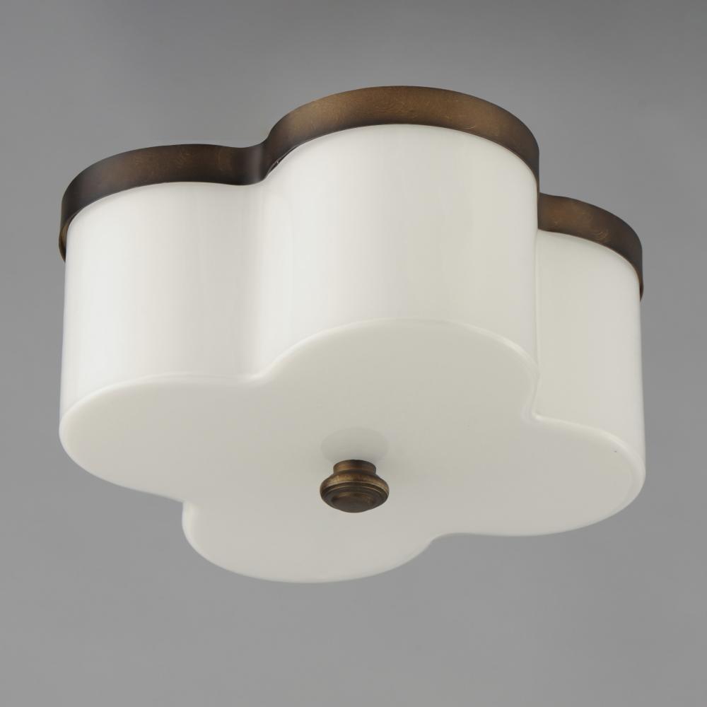 Honoring the traditional scalloped shade design in a range of materials, flush mounts are available in your choice of fabric, metal, or glass shades. The fabric shade features an Off-White linen fabric and is accented with Aged Brass metalwork. In the glas