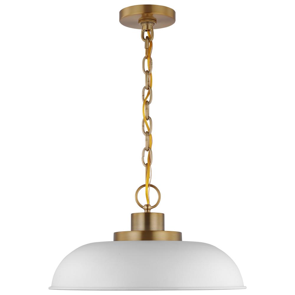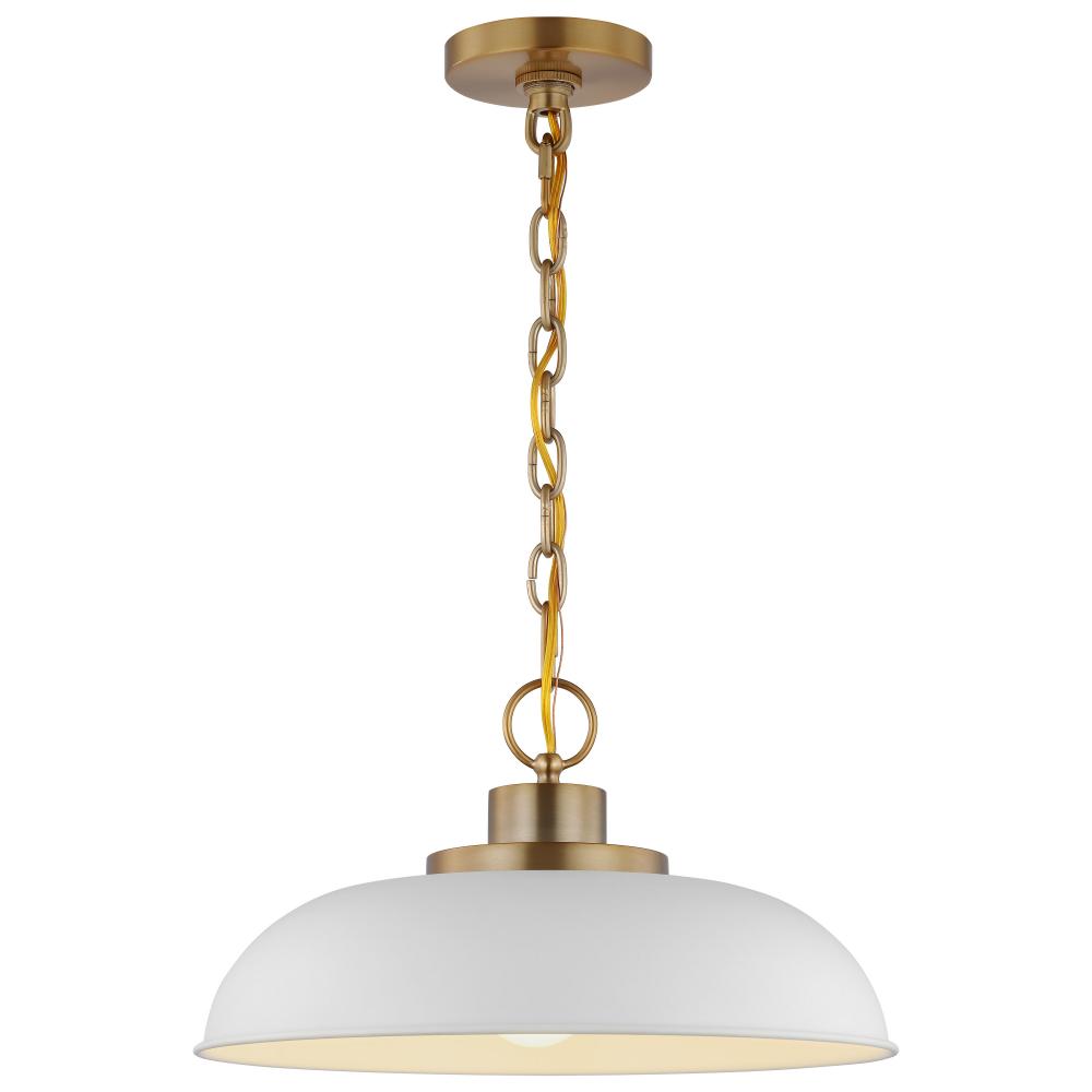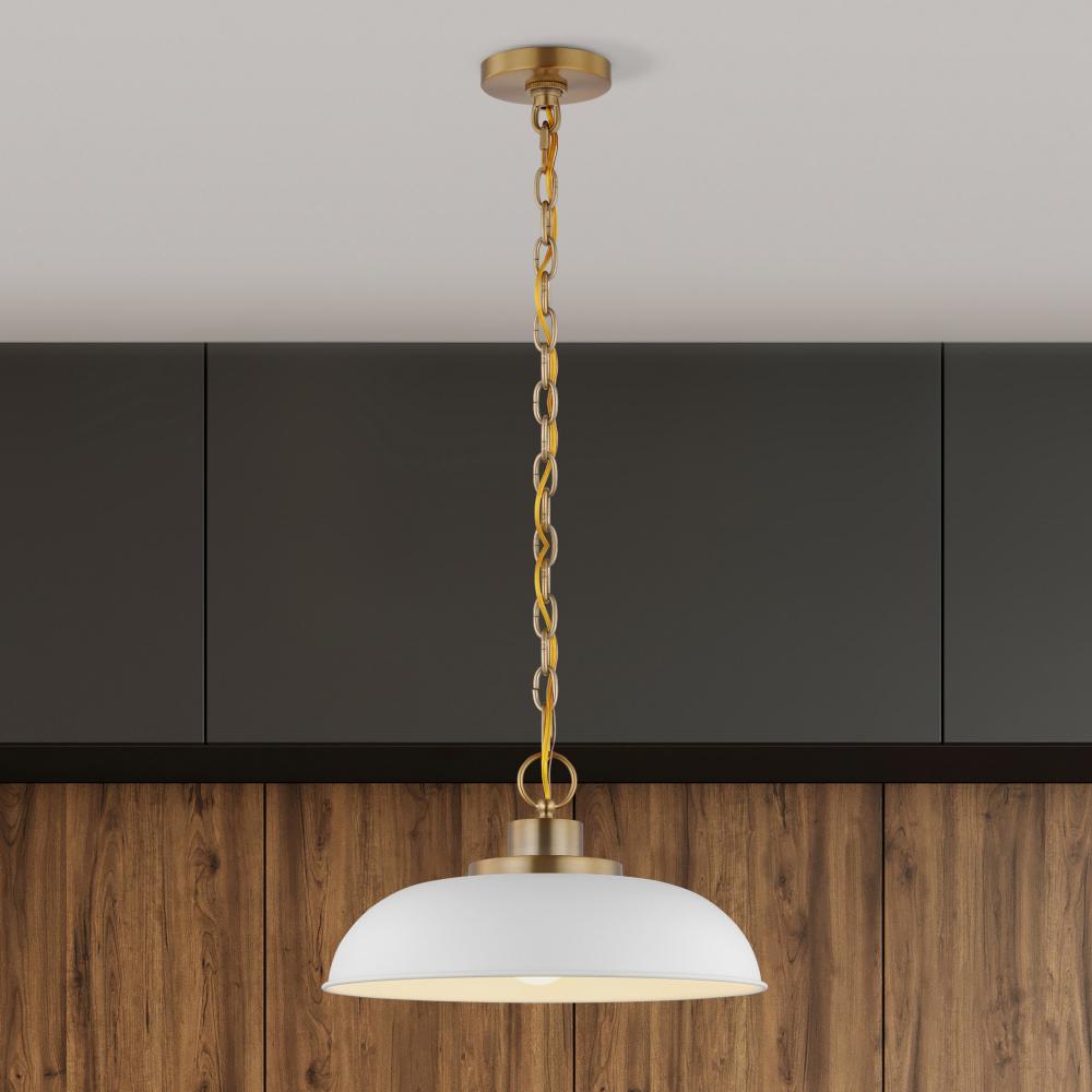 Designed with neutral, clean lines, the Colony 60-7480 small hanging pendant is ideal for an eat-in kitchen, dining room, and even a bedroom. The loft-style shallow pan metal shade is finished in matte white, with a matching interior to reflect the downfac