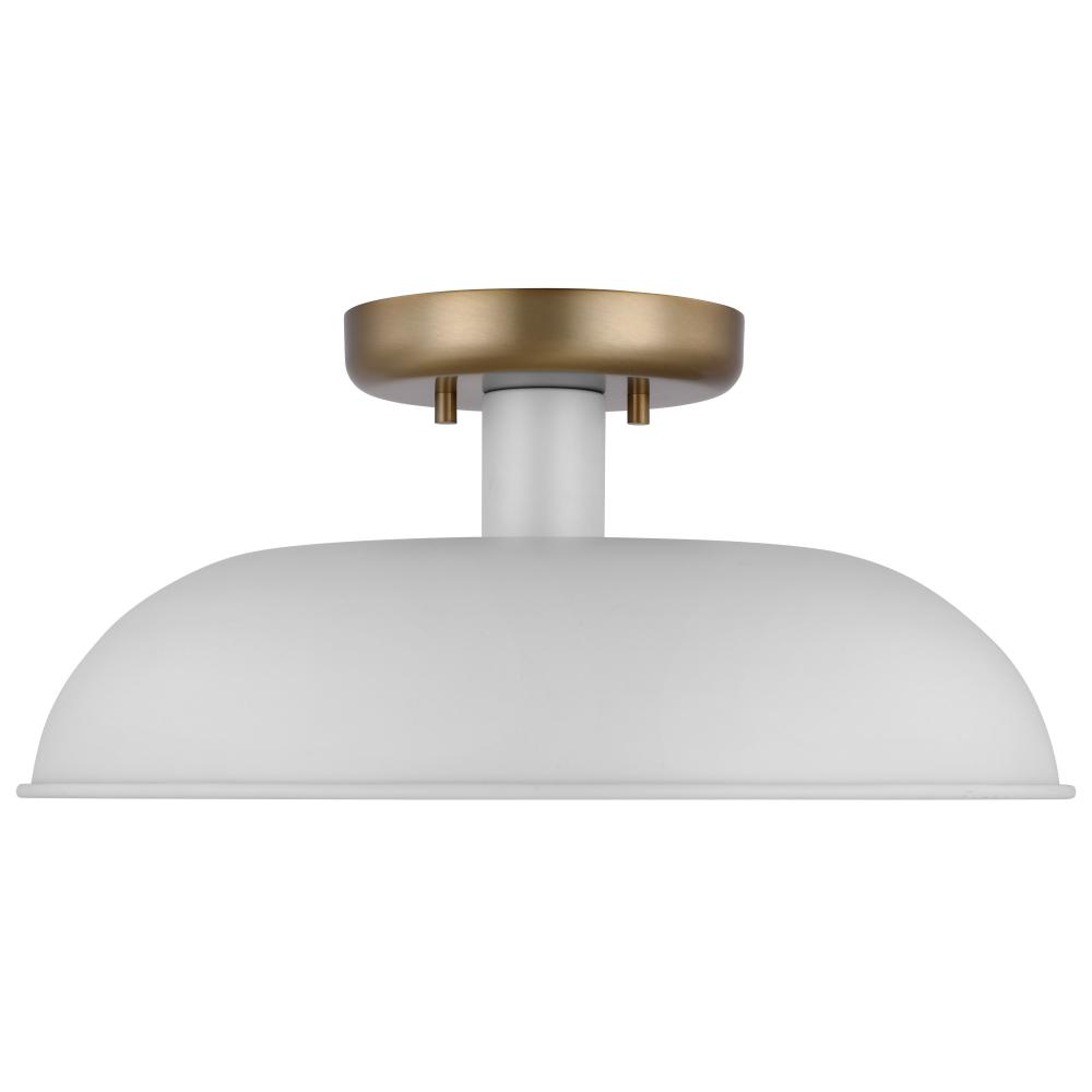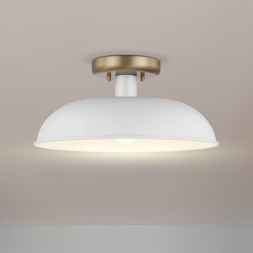 Designed with neutral, clean lines, the Colony small semi-flush is ideal for an eat-in kitchen, entryway, hallway and even a bedroom. The loft-style shallow pan metal shade is finished in matte white, with a matching interior to reflect the downfacing lamp