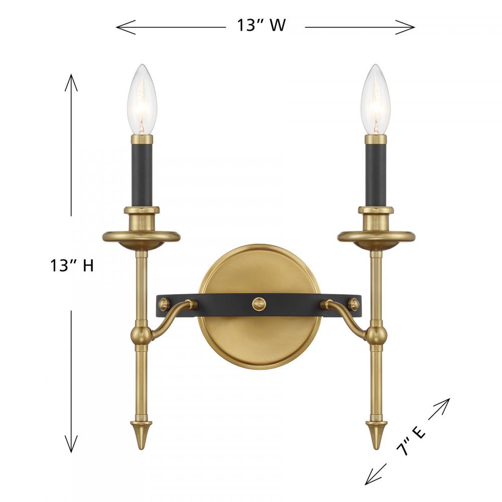 The Savoy House Consulate 2-light wall sconce offers up stately and traditional style with a bold new twist thanks to the two-tone Warm Brass and Black finish. Use it to add a regal touch to any room! Consulate is 13" in height, 13" in width and extends 7" from the wall. It uses two candelabra size bulbs of up to 60 watts per bulb. Bulbs not included. This sconce is damp area rated.