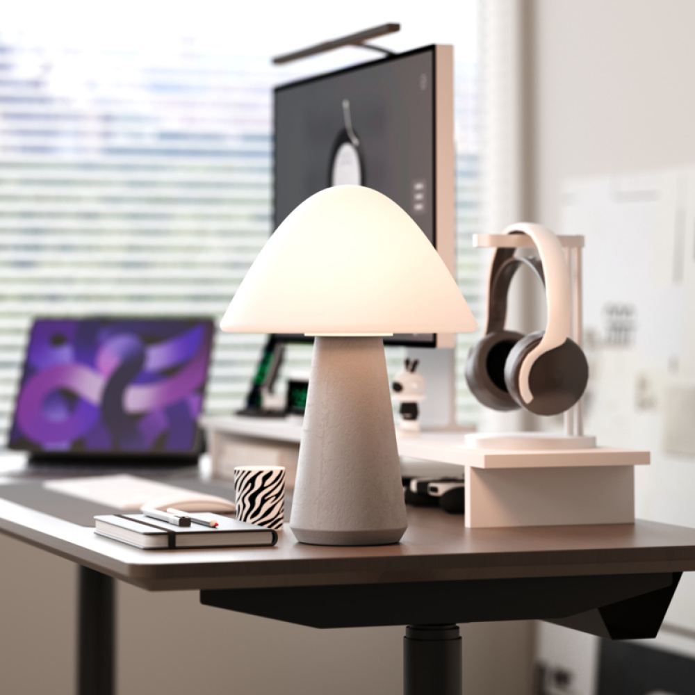 MUSHROOM - where 1960s whimsical design meets contemporary illumination. This delightful accent piece captures the playful essence of iconic mid-century mushroom lamps, reimagined for today's design-conscious spaces. The exquisite cased two-layer opal glass shade creates a mesmerizing soft glow that transforms any environment, while the distinctive cast "color-in" concrete base provides both stability and artistic interest. With its perfectly proportioned dimensions of 8.7" diameter and 12.25" height, MUSHROOM makes a charming yet substantial presence at 4.7 pounds. This portable lighting solution from Kibün by Bulbrite effortlessly moves with you throughout your home, freeing your lighting design from the constraints of outlets and cords. At Kibün by Bulbrite, we've leveraged over 50 years of lighting expertise to create a truly portable lighting solution. MUSHROOM liberates your space from the constraints of cords and outlets, offering remarkable flexibility for both indoor and outdoor settings. Customize your ambient lighting experience with three distinct brightness levels - from a subtle 60-lumen whisper to a room-filling 300-lumen brilliance. The warm white 2700K temperature combined with exceptional 90+ CRI rendering ensures colors appear rich and true beneath MUSHROOM's gentle luminance. Available in four distinctive finishes - classic Off-White, soothing Stone Blue, warm Terracotta, or sophisticated Grey - each MUSHROOM features subtle variations in its concrete base, ensuring your lighting piece is truly one-of-a-kind. Due to the inherent uniqueness of natural stone may feature subtle variations in patterning and coloration, ensuring your lighting piece is truly one-of-a-kind.