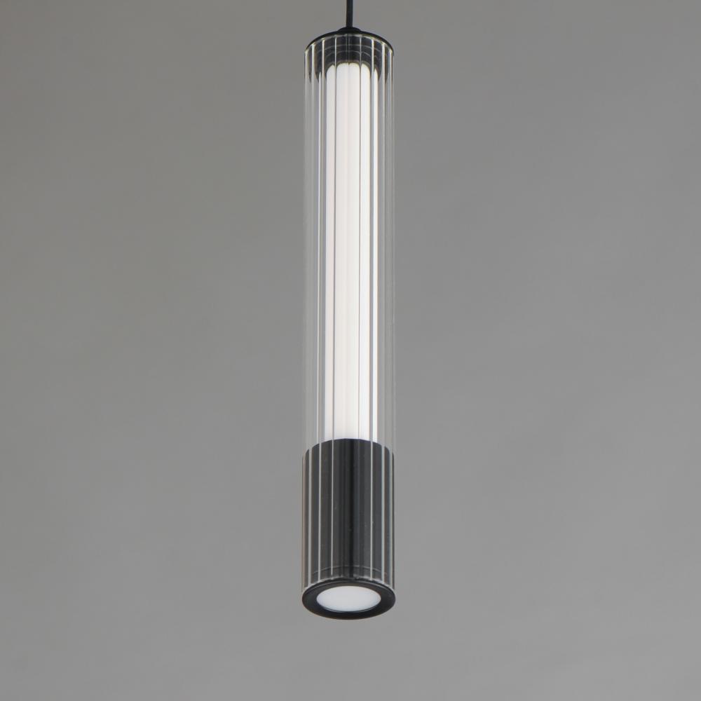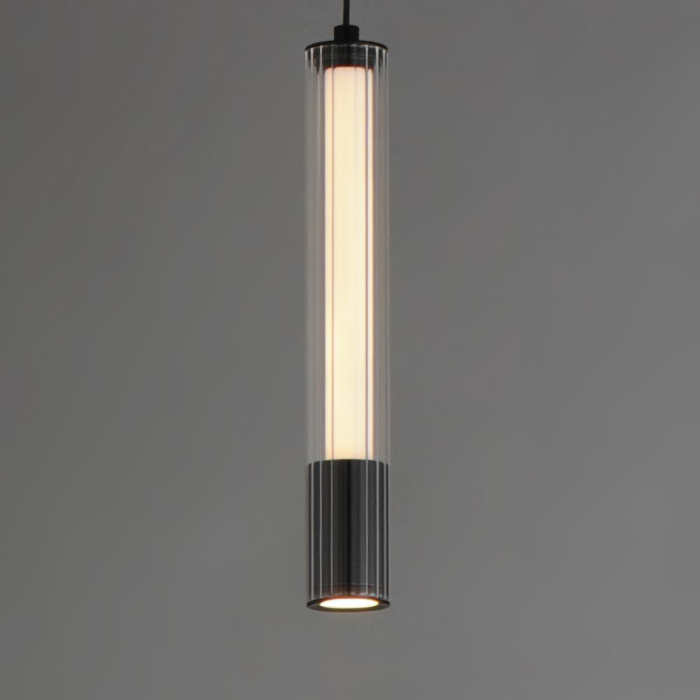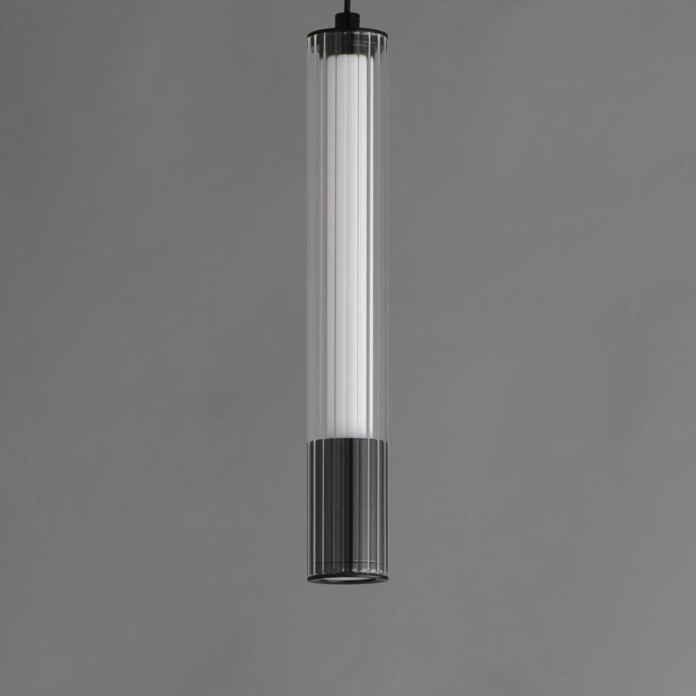 A central, cylinder diffuser of opal white acrylic diffuses LED lighting within a cavity of thin ribbed glass of various lengths. Both imaginative and functional, the bright pendants encase an additional down light recessed within a Polished Chrome, Natura