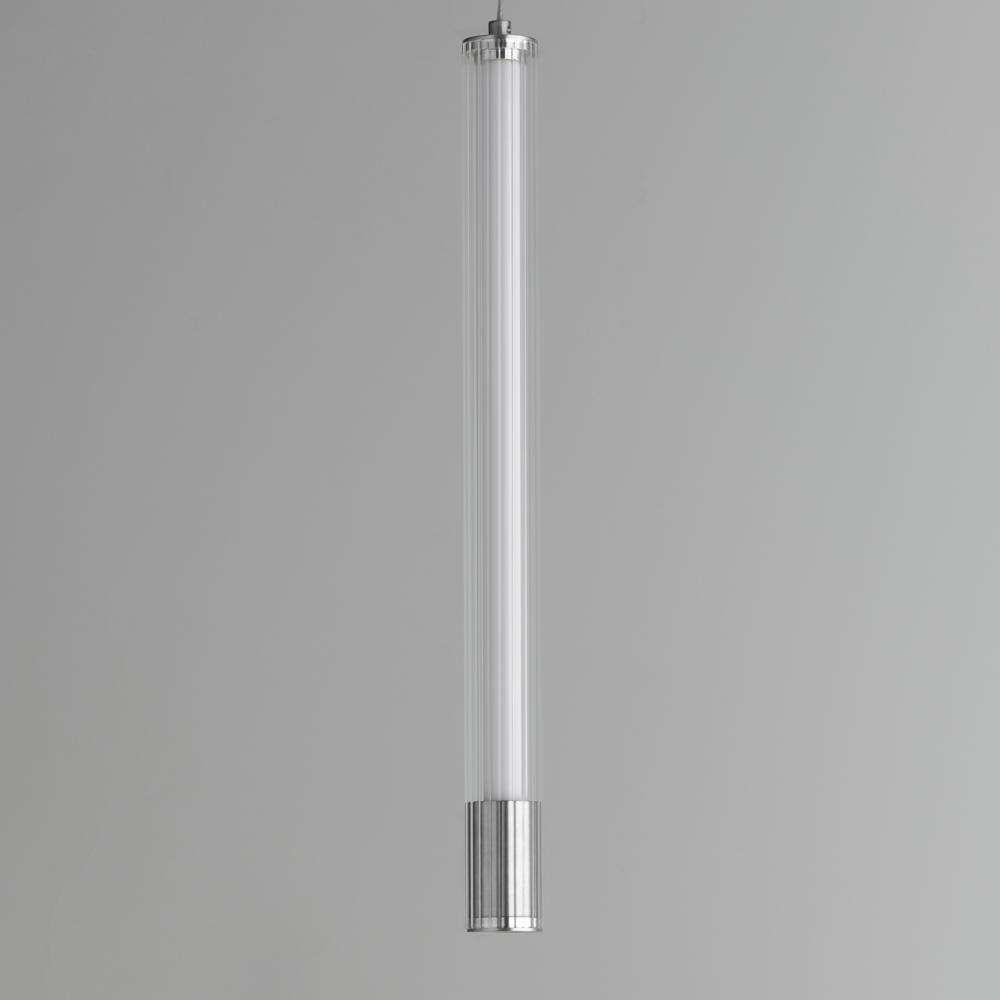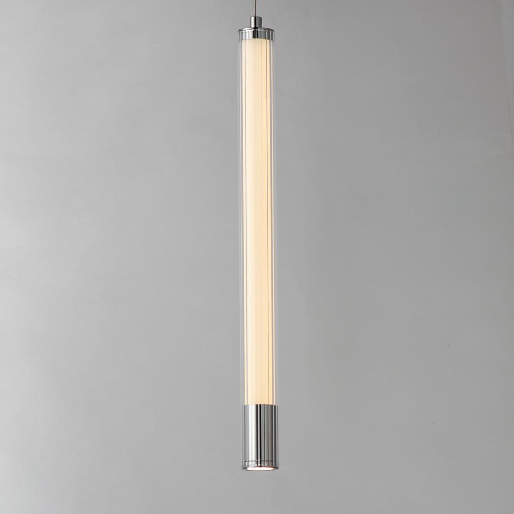 A central, cylinder diffuser of opal white acrylic diffuses LED lighting within a cavity of thin ribbed glass of various lengths. Both imaginative and functional, the bright pendants encase an additional down light recessed within a Polished Chrome, Natura
