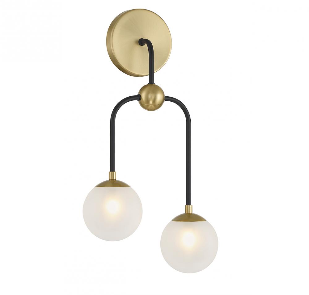 The midcentury-inspired Savoy House Couplet 2-light sconce is like a waterfall of style featuring curved branching arms topped with orbs of sanded glass. Finished in matte black with warm brass accents. Couplet is 20" in height, 10.75" in width and extends 4.75" from the wall.