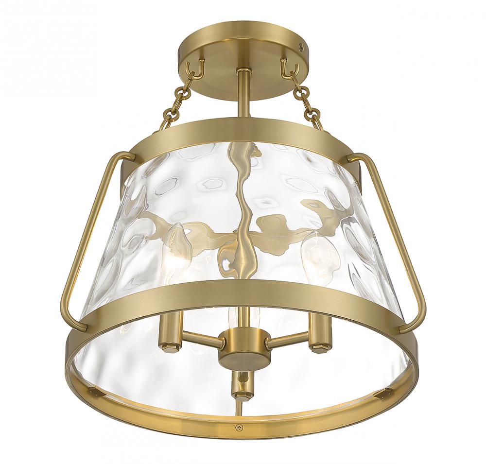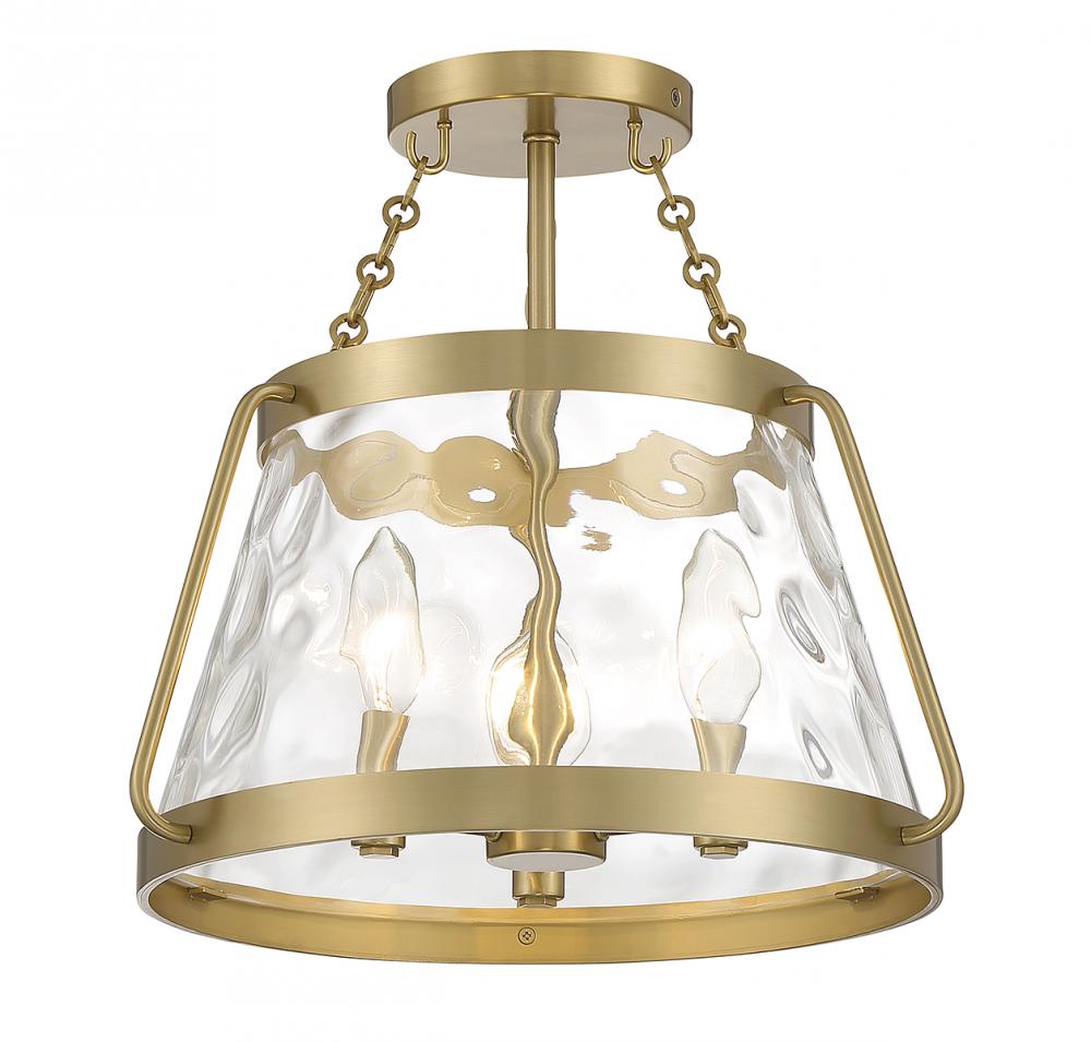 The Savoy House Crawford 3-light ceiling semi-flush mount proves that a classic style can be stunning! A lantern-inspired shade of clear water glass hangs down from an understated structure with industrial-inspired details. Finished in warm brass. Crawford is 13.5” in height and 15” in width. It uses 3 candelabra size bulbs of up to 60 watts per bulb (bulbs not included).