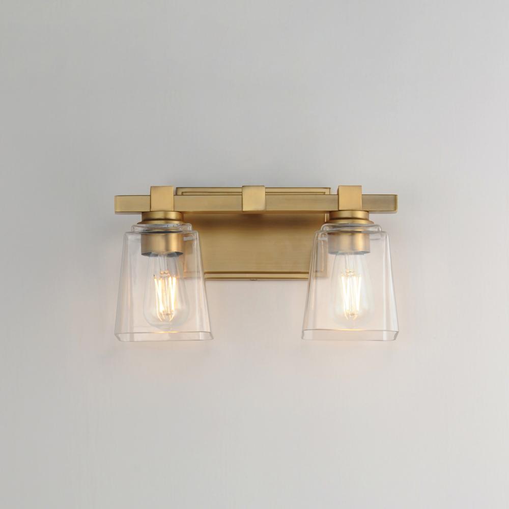 A composition of square forms that feature a Clear tapered square glass shade, these bath vanities provide a transitional design that suits both modern and traditional spaces. Available in Matte Black, Polished Chrome, Satin Nickel, and Natural Aged Brass.