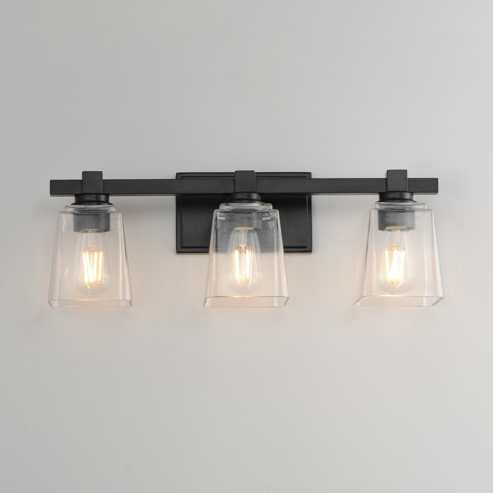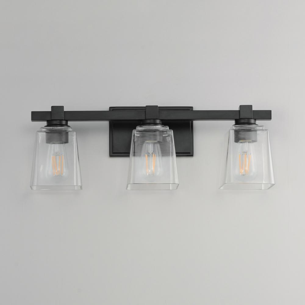 A composition of square forms that feature a Clear tapered square glass shade, these bath vanities provide a transitional design that suits both modern and traditional spaces. Available in Matte Black, Polished Chrome, Satin Nickel, and Natural Aged Brass.