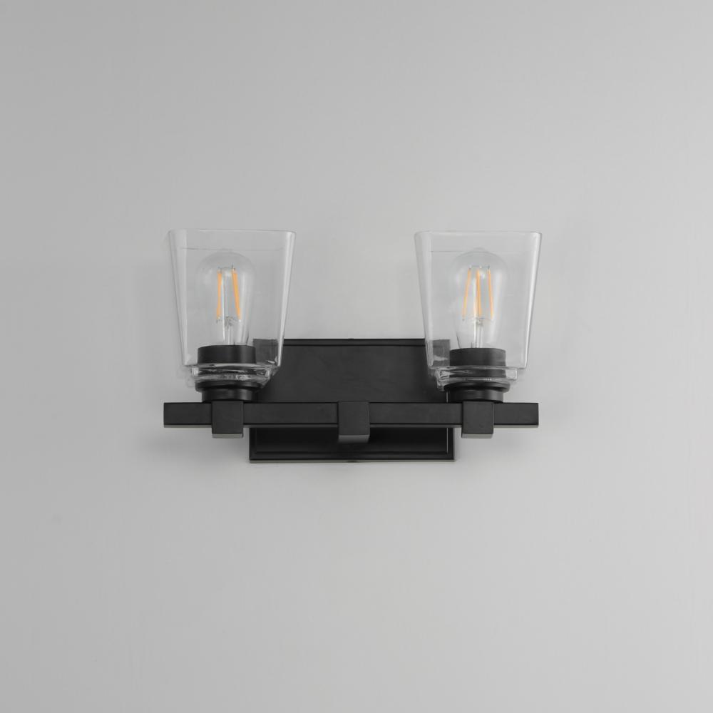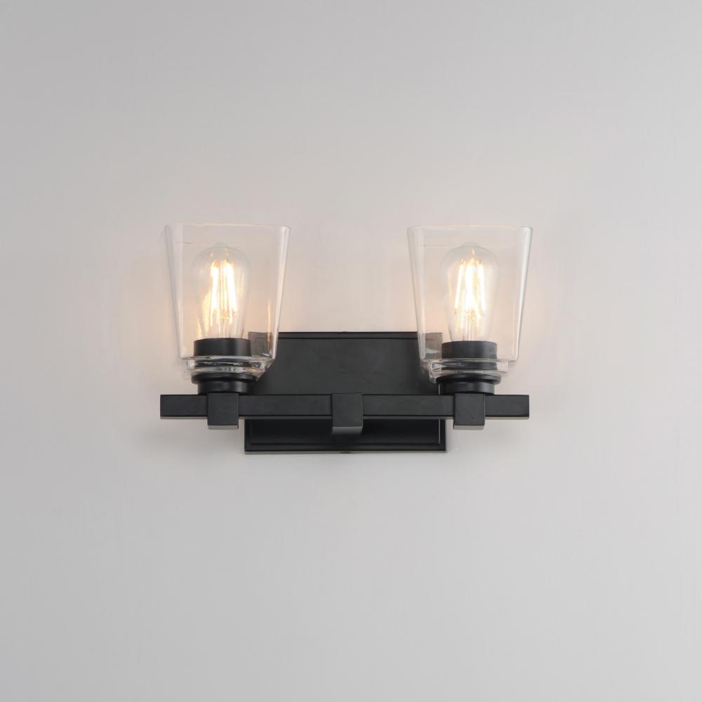 A composition of square forms that feature a Clear tapered square glass shade, these bath vanities provide a transitional design that suits both modern and traditional spaces. Available in Matte Black, Polished Chrome, Satin Nickel, and Natural Aged Brass.