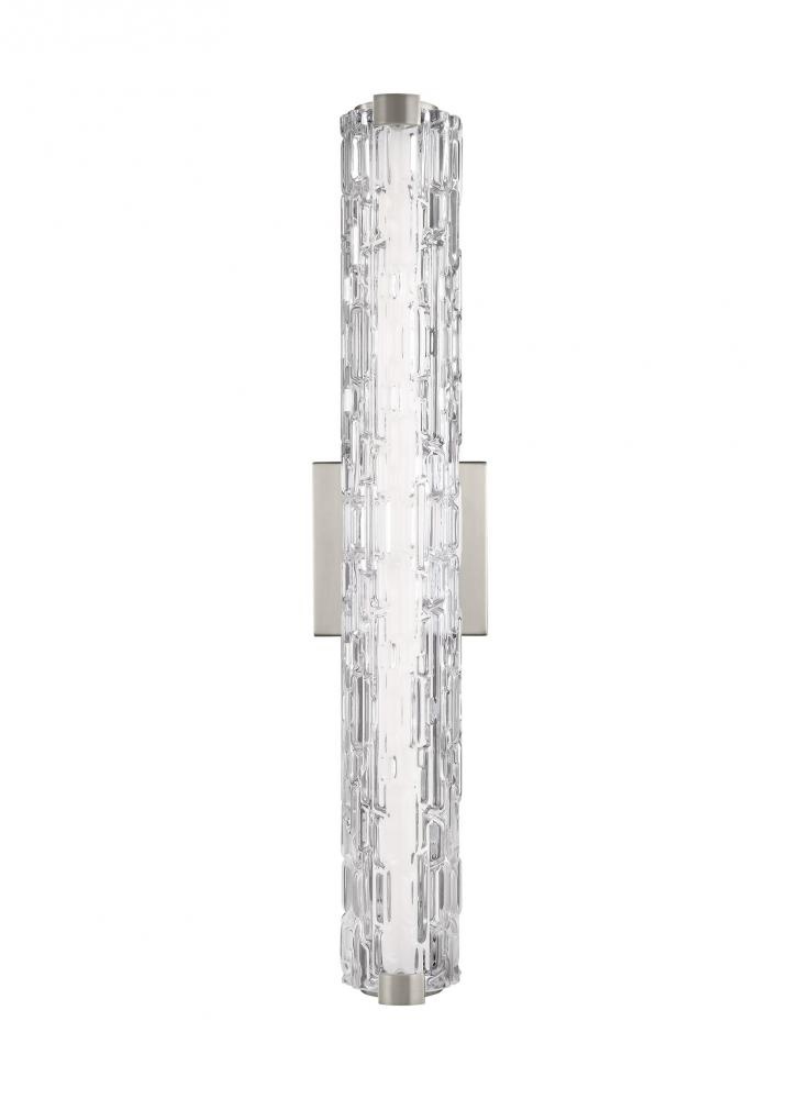 The Cutler one-light wall sconce in chrome offers shadow-free lighting in your powder room, spa, or main bathroom. The sleek linear profile of the Cutler Collection creates a perfect, contemporary backdrop for two unique glass options. Tiles of either Clear Crackle glass or Clear Staggered Rock glass are set in an organic version of a subway tile "look" and allow the LED light to shine through, adding rich sparkle to the room. Cutler is available in two finish options: Chrome and Satin Nickel.