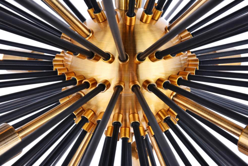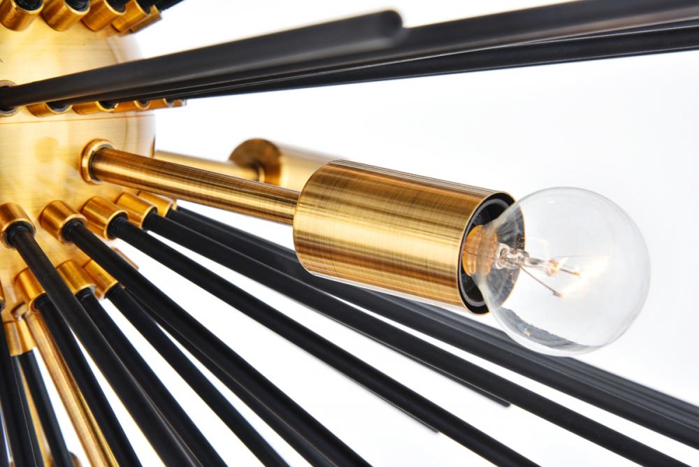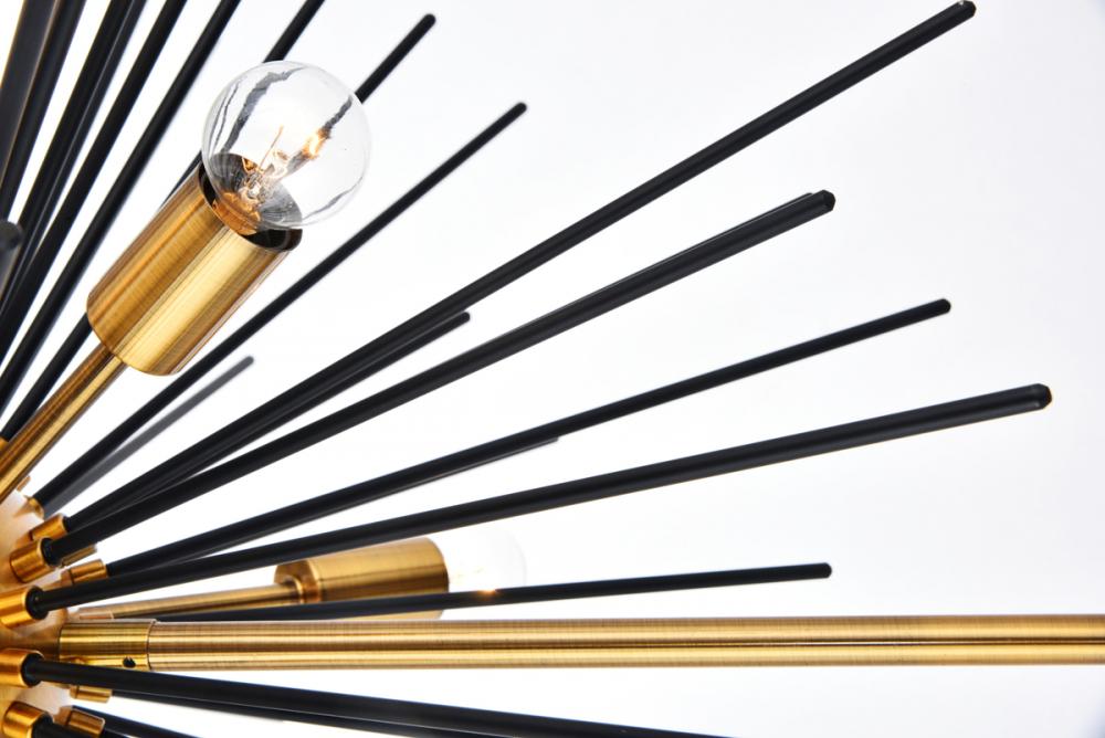 Modern simplicity with a touch of Roaring ’20s flair, Daegan hanging fixtures bring effortless radiance to a bedroom, living room, study, kitchen, bar, or foyer. This sunburst-style hanging pendant comes in a light antique brass finish and features an Iron hanging tube and disk-shaped canopy. Matte black rods radiate out from the central frame, giving the lamp a unique two-tone appearance, while exposed bulbs are interspersed throughout to create a multidirectional lighting effect.