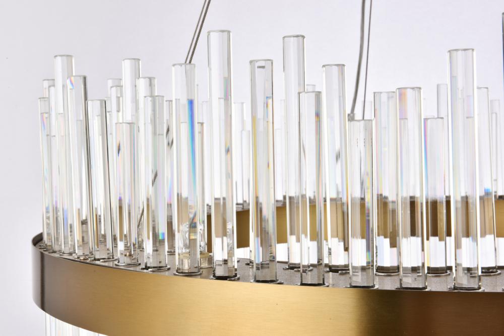 This stately fixture combines timeless elegance with modern and attractive sophistication. The delicate juxtaposition of upright and hanging clear glass rods creates a truly stunning visual statement, seamlessly woven together within a sleek gold frame. This expressive piece would be a welcomed and treasured addition to a wide range of contemporary residential styles.
