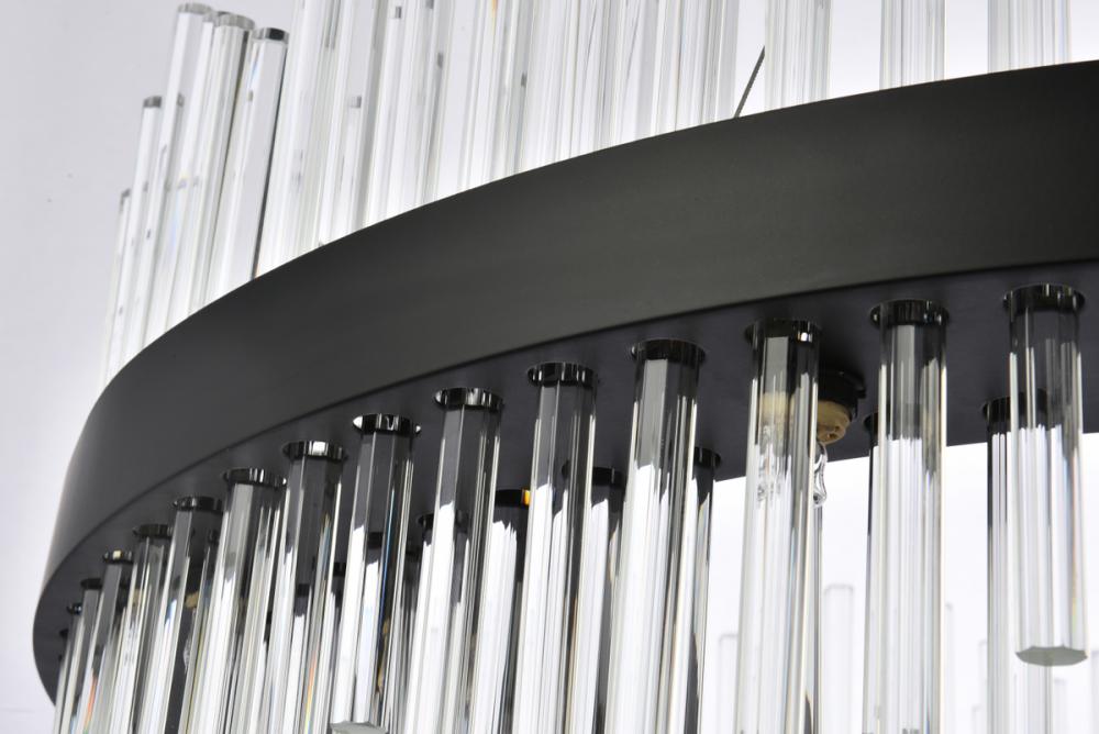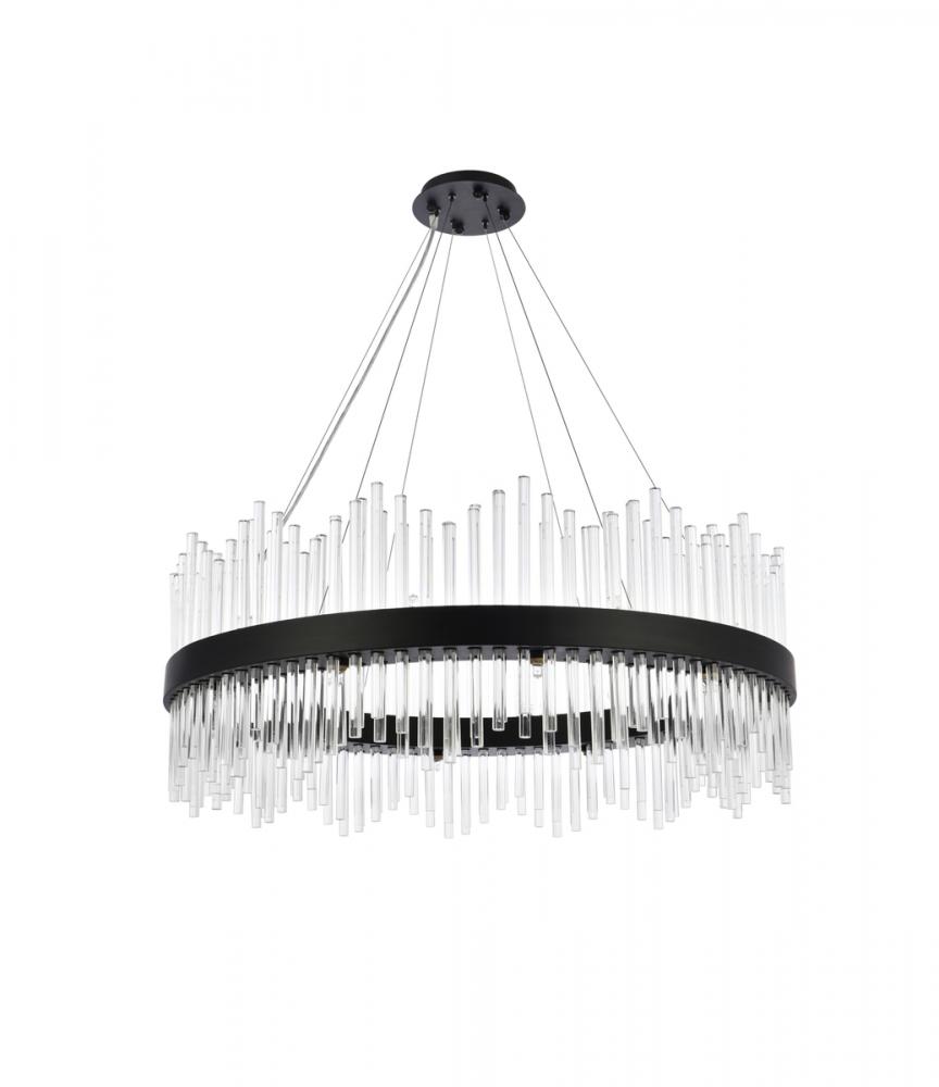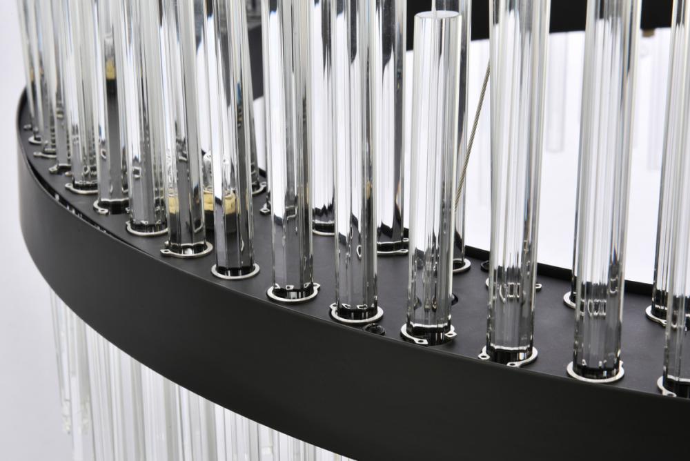 This stately fixture combines timeless elegance with modern and attractive sophistication. The delicate juxtaposition of upright and hanging clear glass rods creates a truly stunning visual statement, seamlessly woven together within a sleek bold metal frame. This expressive piece would be a welcomed and treasured addition to a wide range of modern residential styles.