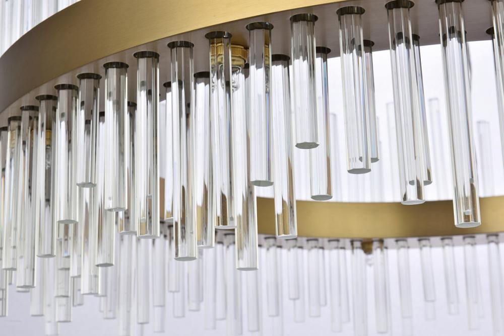 This stately fixture combines timeless elegance with modern and attractive sophistication. The delicate juxtaposition of upright and hanging clear glass rods creates a truly stunning visual statement, seamlessly woven together within a sleek bold metal frame. This expressive piece would be a welcomed and treasured addition to a wide range of modern residential styles.