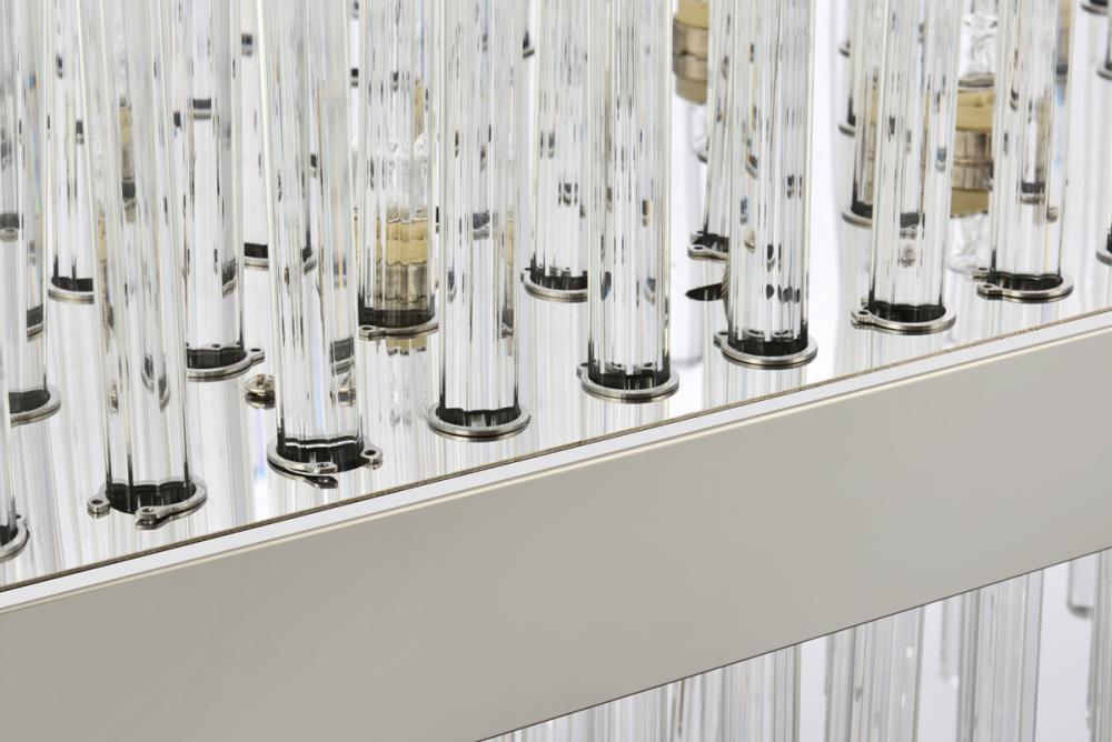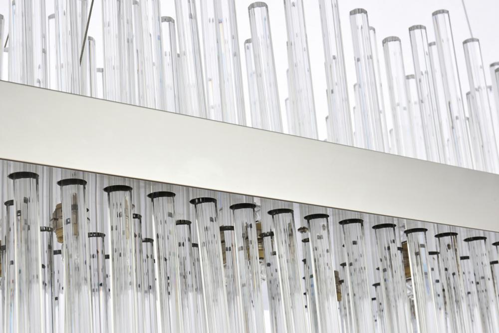 This stately fixture combines timeless elegance with modern and attractive sophistication. The delicate juxtaposition of upright and hanging clear glass rods creates a truly stunning visual statement, seamlessly woven together within a sleek bold metal frame. This expressive piece would be a welcomed and treasured addition to a wide range of modern residential styles.