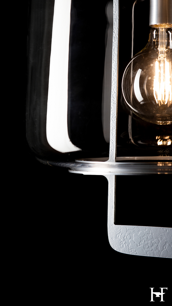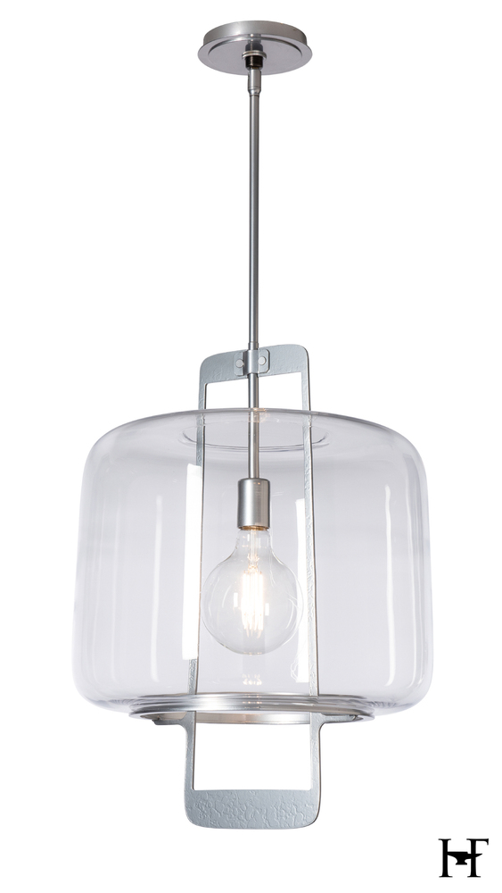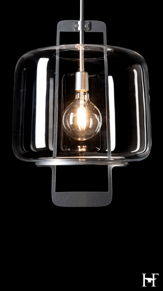 Bold geometrics are at play with the Dane Lantern. A tall, open vertical flared rectangular hand-forged steel is the focal piece for this fixture with a large glass cylinder sitting on its steel rim that houses a central bulb.