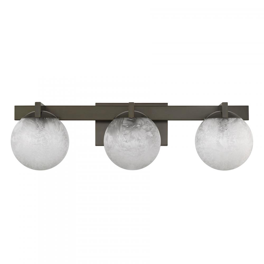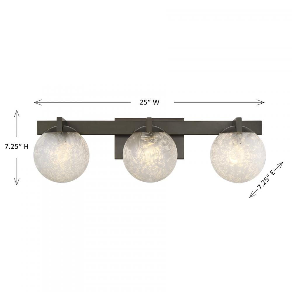 The Savoy House Darien is a 3-light bath bar with fabulously chilly appeal. A minimal frame is finished in bold Mediterranean Bronze and holds three orbs of Ice Glass, adding sub-zero cool with tons of frosty texture. Darien is 7.25" in height, 25" in width and extends 7.25" from the wall. Uses three candelabra size bulbs of up to 60 watts per bulb. Bulbs not included. This bath bar is damp area rated.