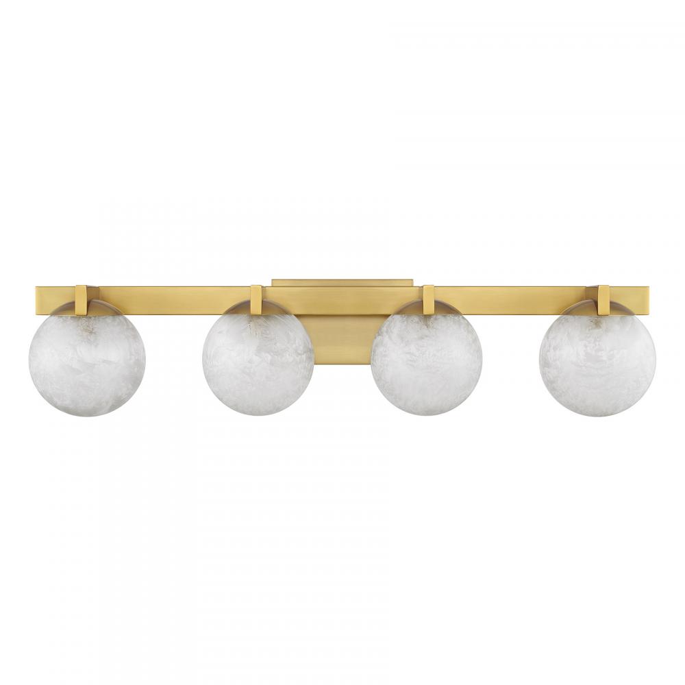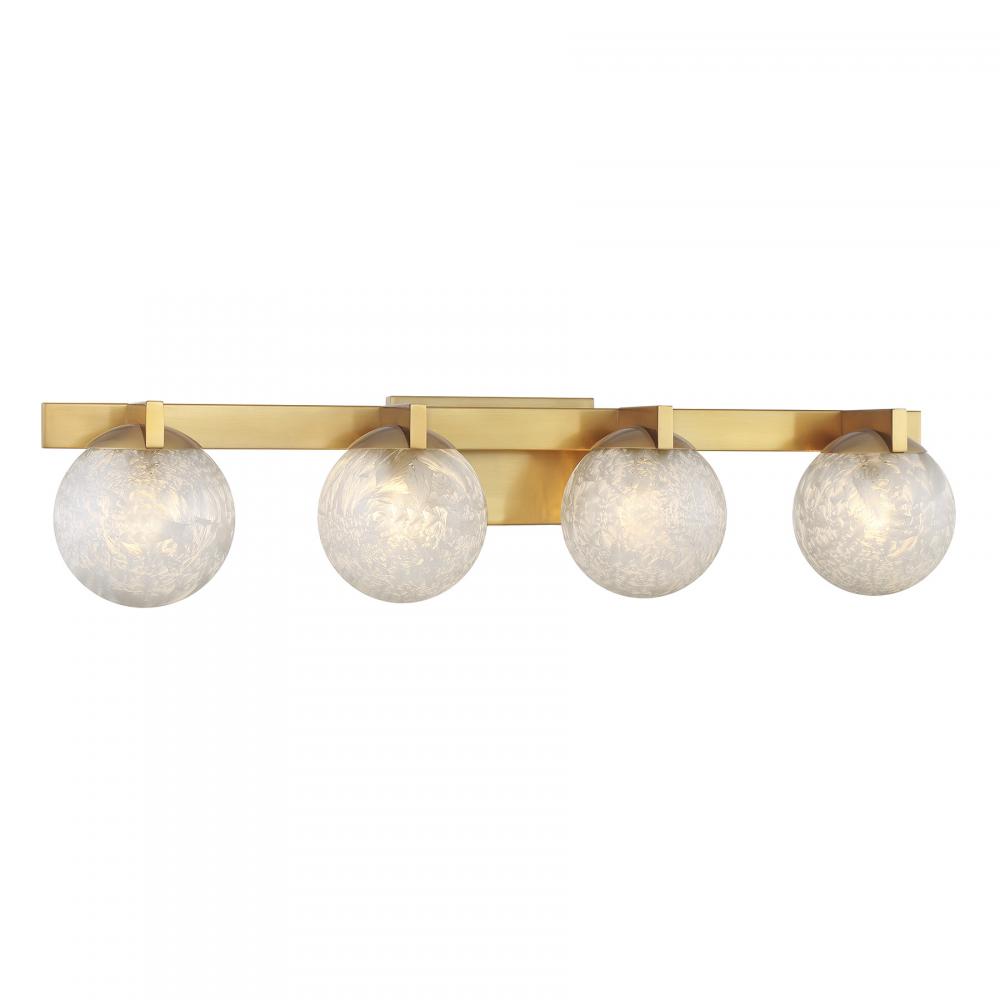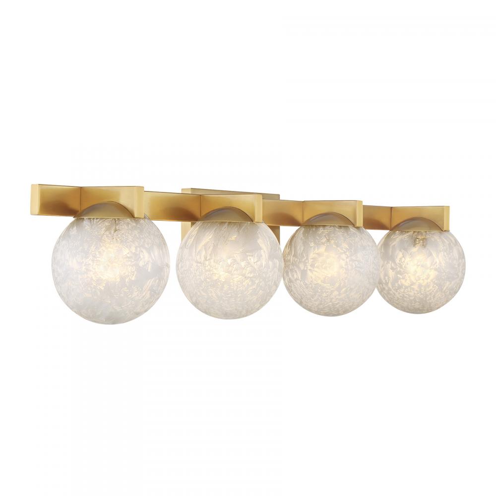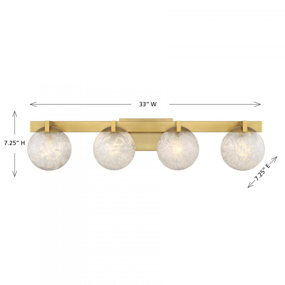 The Savoy House Darien is a 4-light bath bar with fabulously chilly appeal. A minimal frame is finished in bold Warm Brass and holds four orbs of Ice Glass, adding sub-zero cool with tons of frosty texture. Darien is 7.25" in height, 33" in width and extends 7.25" from the wall. Uses four candelabra size bulbs of up to 60 watts per bulb. Bulbs not included. This bath bar is damp area rated.