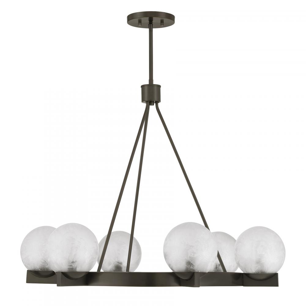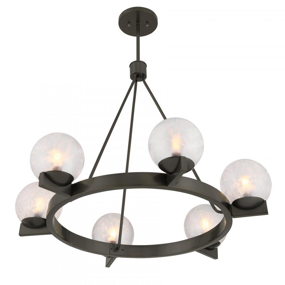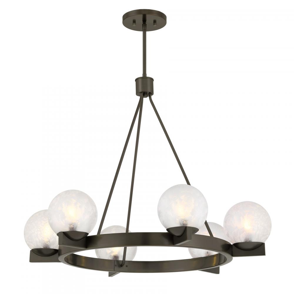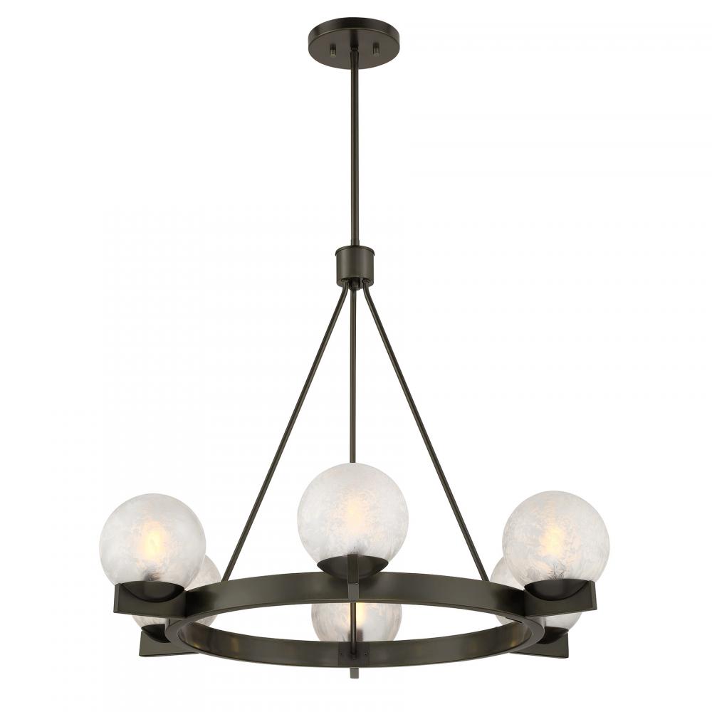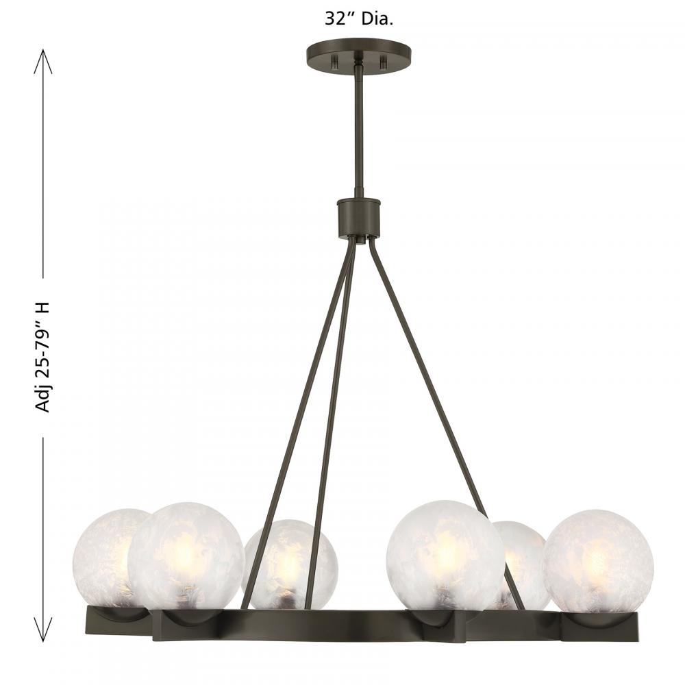 The Savoy House Darien is a 6-light chandelier with fabulously chilly appeal. A minimal, circular frame is finished in bold Mediterranean Bronze and holds six orbs of Ice Glass, adding sub-zero cool with tons of frosty texture. Darien is 32" in width and has an adjustable height ranging from 25" to 79". Uses six candelabra size bulbs of up to 60 watts per bulb. Bulbs not included. Comes with four 12" downrods and one 6" downrod.
