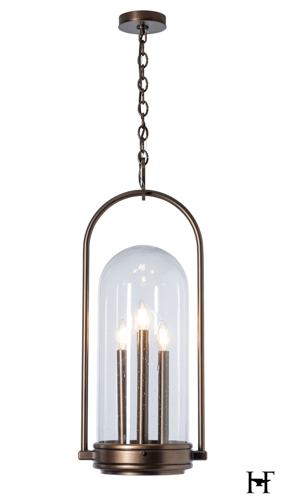 This tall, slim focal piece is chain-hung, allowing it to easily be placed to light verandas, patios and entryways. The Davis is a fresh interpretation of a traditional lantern style, featuring a clear, seeded, domed glass cylinder with four tall, exposed candlesticks. Its stylized hook is but one of the beautiful details of this hanging fixture. Available in a choice of AAMA 2604-rated Coastal Outdoor Finishes.