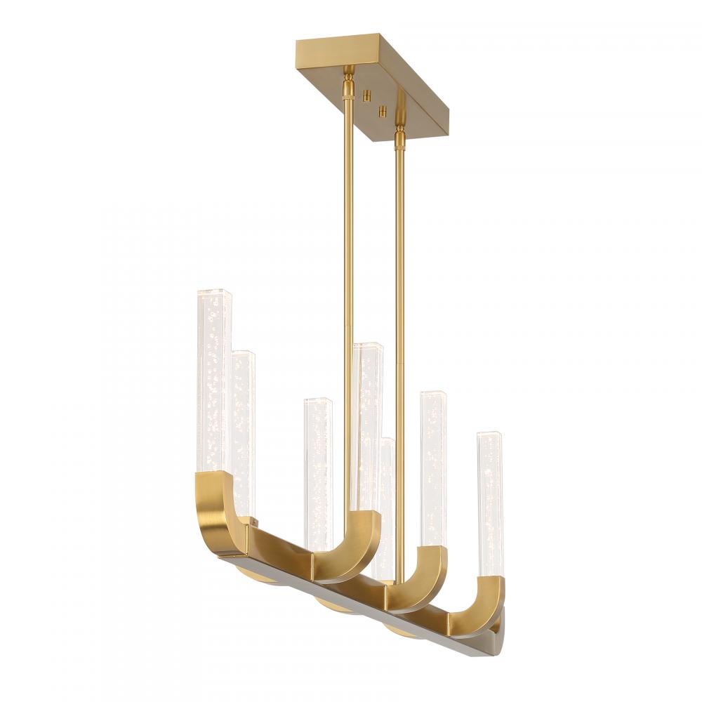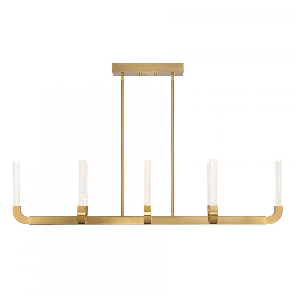 The Savoy House Del Mar 8-light linear chandelier was designed by Breegan Jane, an award-winning interior designer and TV host. Its sleek and slim structure is a stunning example of how Breegan's designs bring the drama without overtaking the room. LED light shines through clear seeded acrylic batons, adding eye-catching texture. Finished in Warm Brass. At 48" in length, 7.5" in width and with an adjustable height ranging from 11" to 55", Del Mar is ideal for illuminating larger spaces. Comes with eight 12" downrods and two 6" downrods.