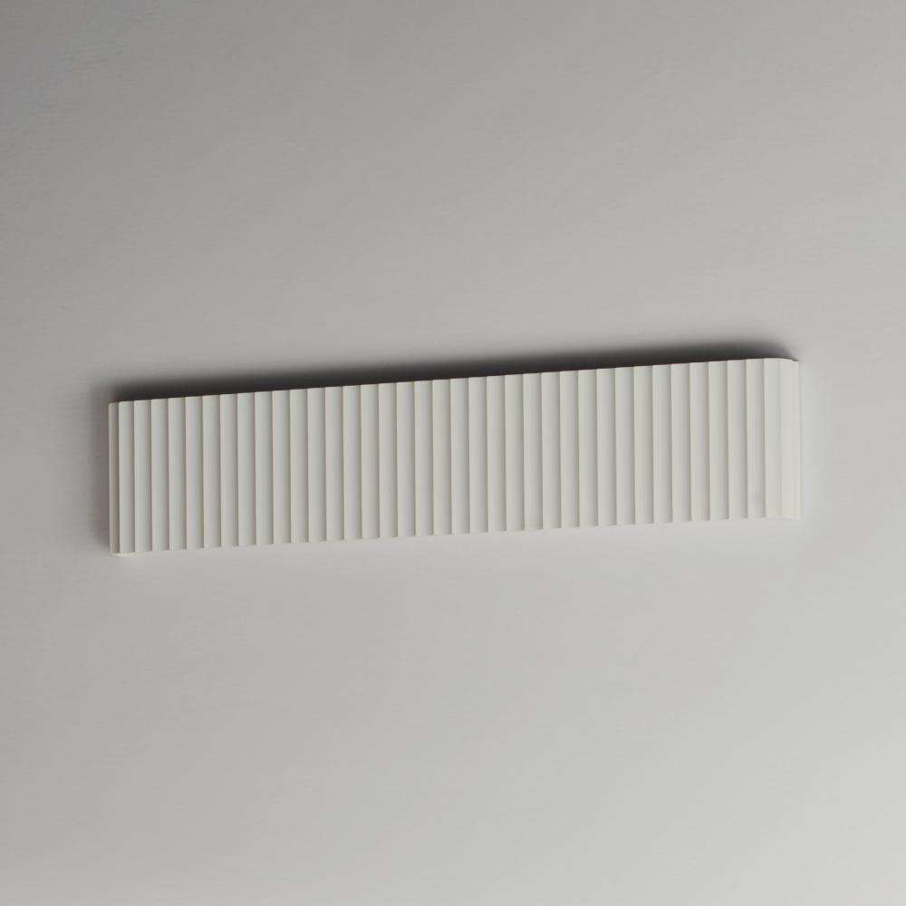 Long spans of fluted concrete panels blend Western classicism with modern technology. Scalloped concrete is finished in a Chalky White finish and suitable for damp locations. Choose from stem hung pendants or backlit wall panels that provide ambient light