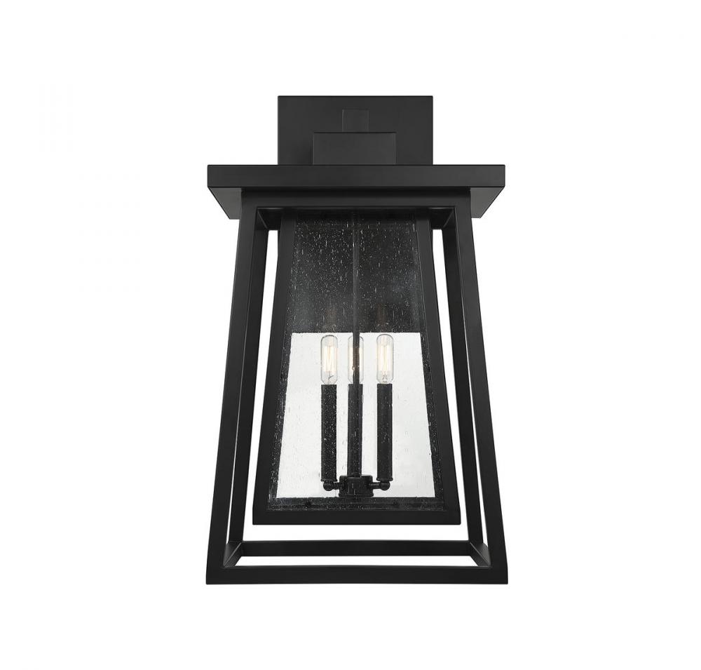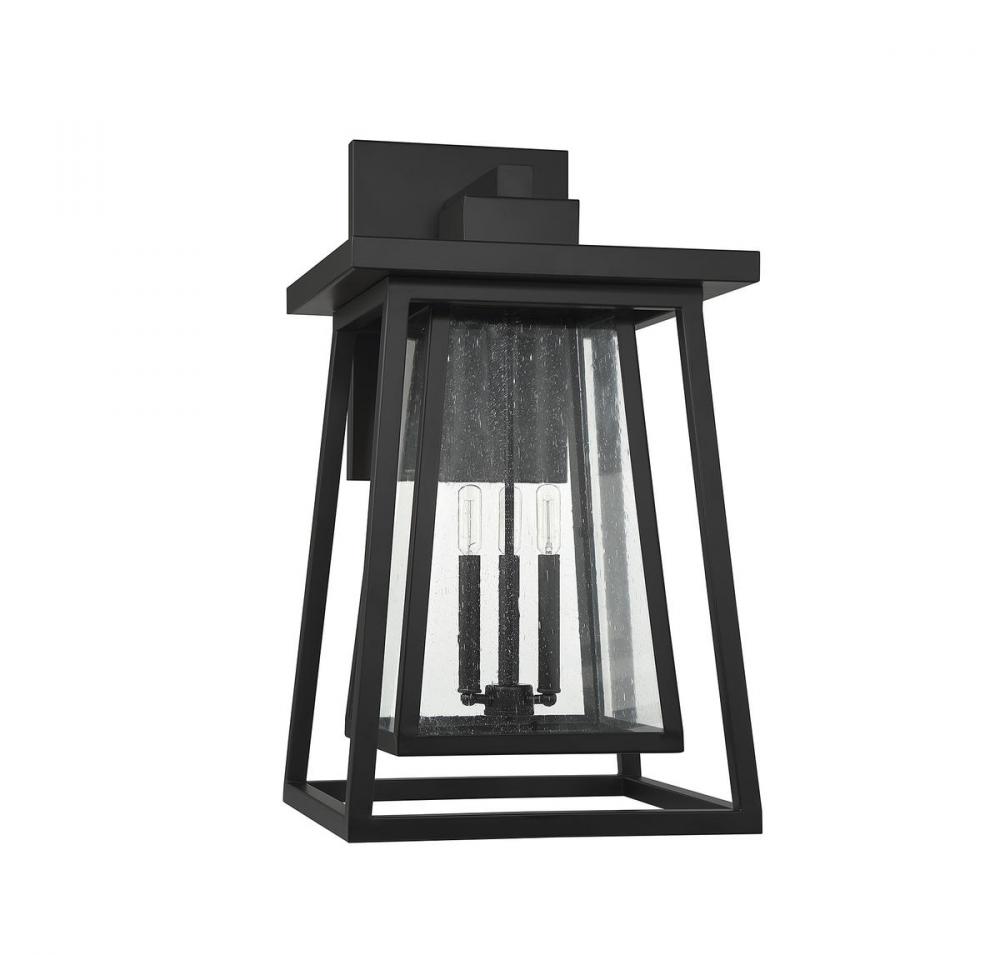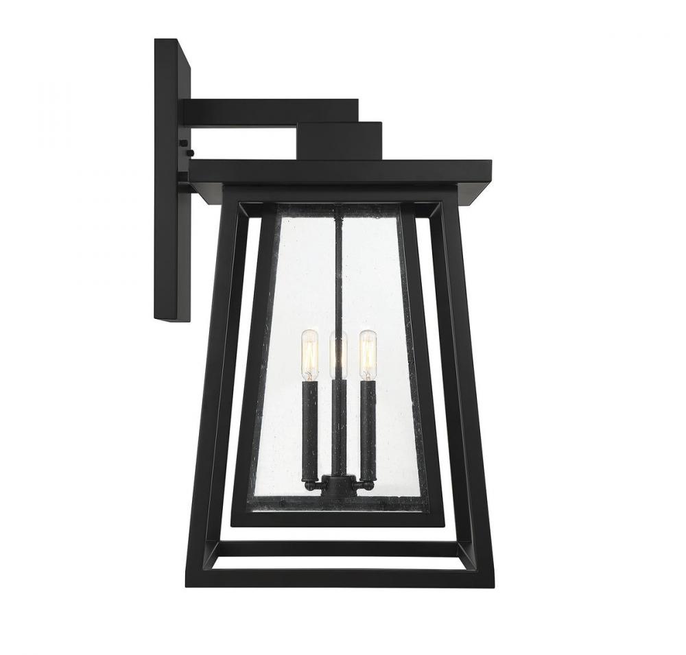 Boost your curb appeal and create a great first impression with the Craftsman-inspired style of the Savoy House Denver 3-light outdoor wall lantern. Clear seedy glass and a matte black finish make Denver a great choice for lighting up today's fashionable homes. This fixture is 29" in height, 16" in width and extends 17" from the wall. It uses three candelabra size bulbs with a max of 60 watts per bulb. Wet area rated.