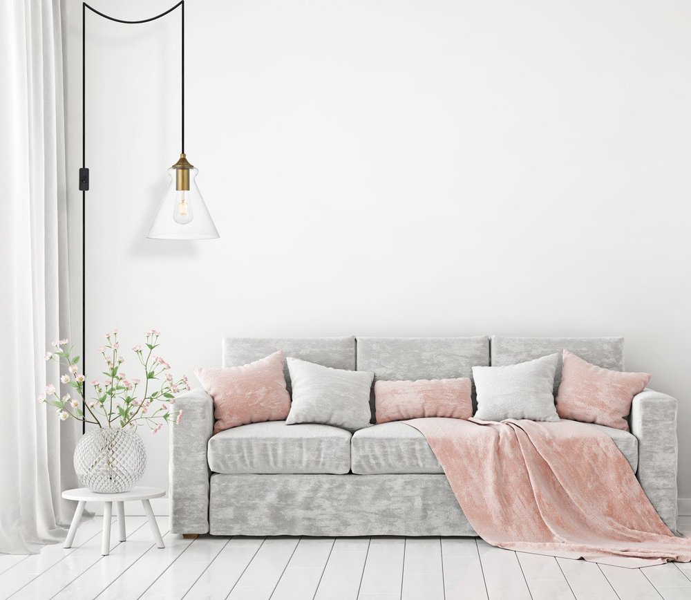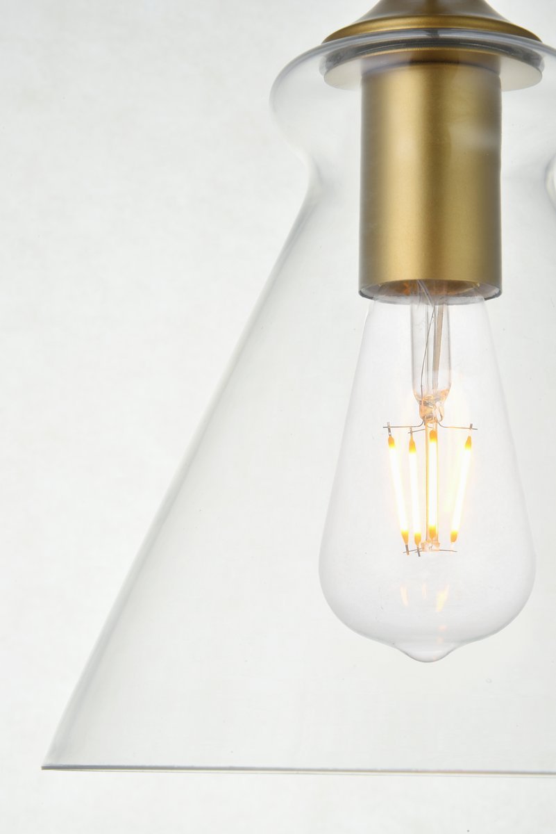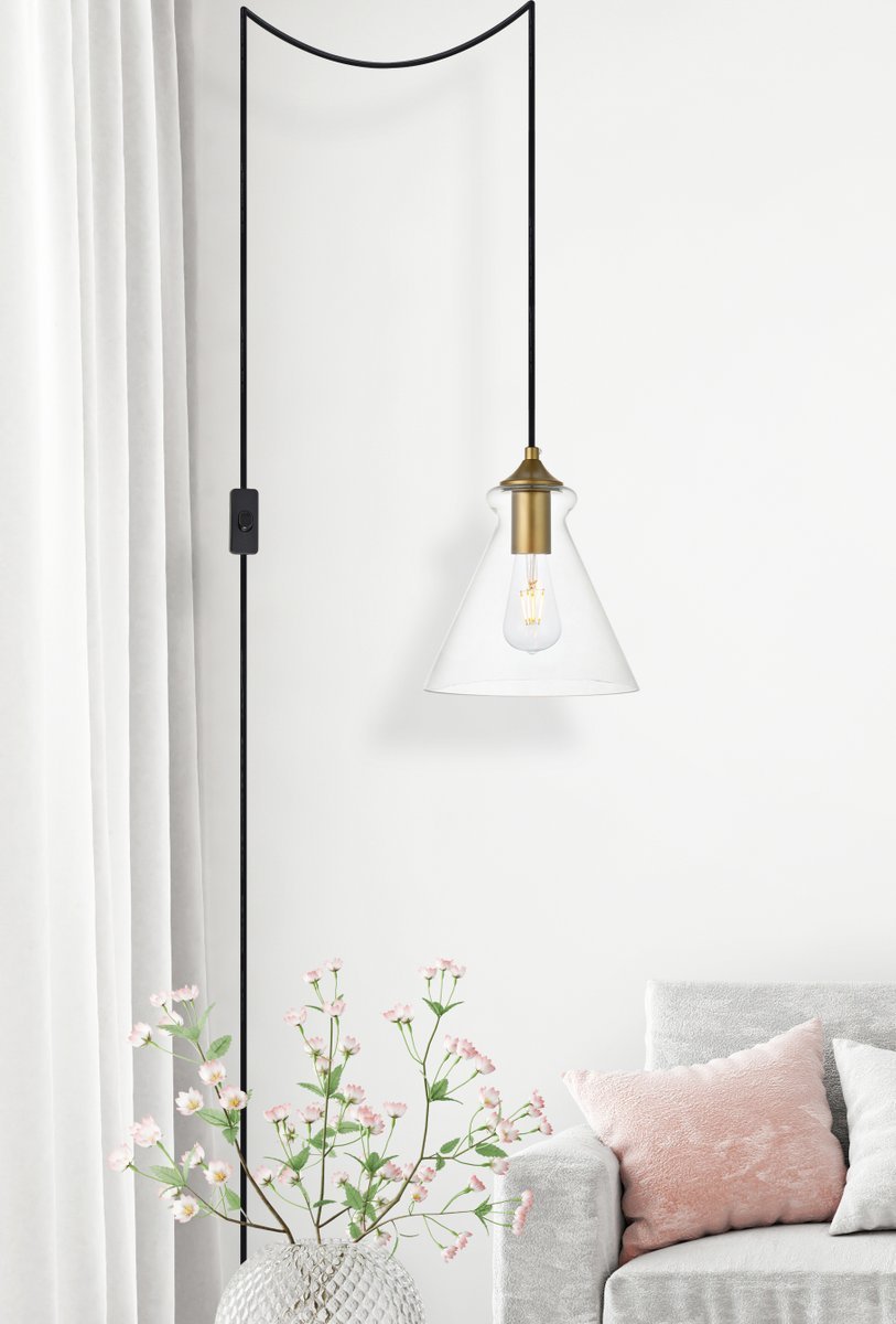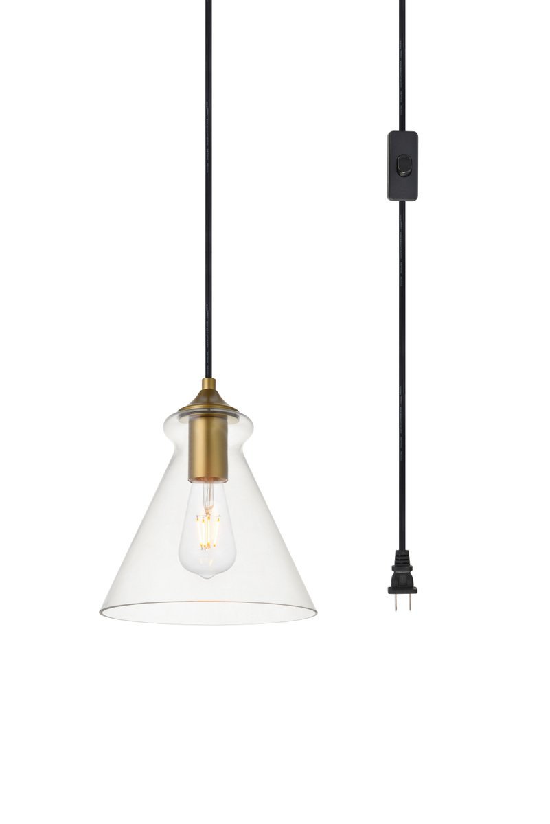 The small, but mighty Destry collection offers sleek pendant lamps that will add a powerful accent to your urban, industrial, or transitional décor. The light’s brass hardware finish adds to the interest of the piece. Brass 'top hat' design accentuates the clear glass shade. Each brass and clear conical shade holds one incandescent or LED light bulb (not included). Brighten your kitchen island, bathroom, entryway, or den with this one-light statement fixture. Plug-in design for easy access lighting with built-in on/off switch. Simply hang this piece on the provided swag hooks and plug it in for an effortlessly easy installation - can be hung from a sloped or vaulted ceiling.