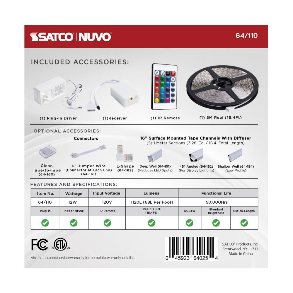 Visit Satco.com for optional accessories from a variety of channels with diffusers (64-150, 64-151, 64-152, 64-154), tape-to-tape connector (64-160), 6-in jumper wire (64-161), 90 degree connector (64-162)